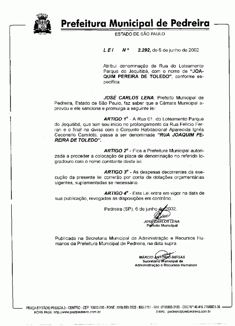 Ementa: Atribui denominação de Rua do Loteamento Parque do Jequitibá, com o nome de "Joaquim Pereira de Toledo", conforme especifica.
