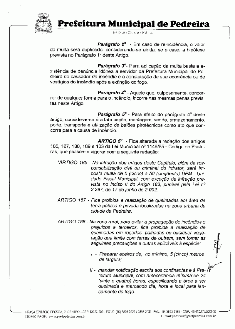 Ementa: Proíbe a realização de incêndios em vegetação localizada em área de terra pública ou privada na área urbana da cidade de Pedreira, fixa sanções administrativas e dá outras providências.