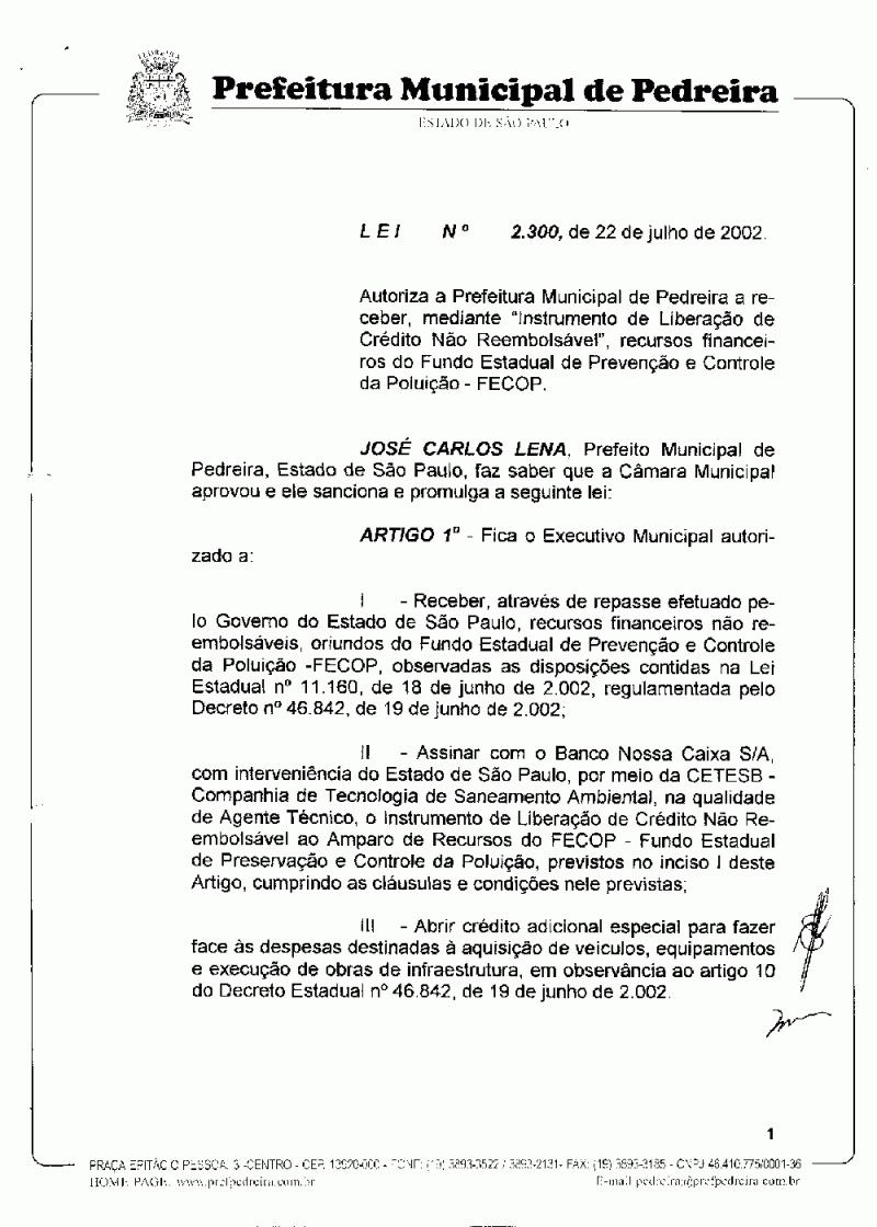 Ementa: Autoriza a Prefeitura Municipal de Pedreira a receber, mediante "Instrumentos de Liberação de Crédito Não Reembolsável", recursos financeiros do Fundo Estadual de Prevenção e Controlo da Poluição - FECOP.