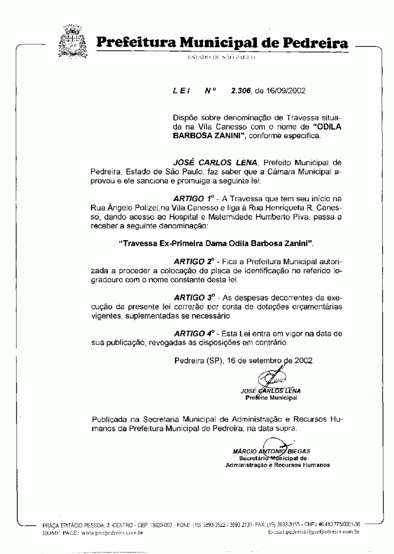 Lei Municipal - N° 2306 de 16/09/2002