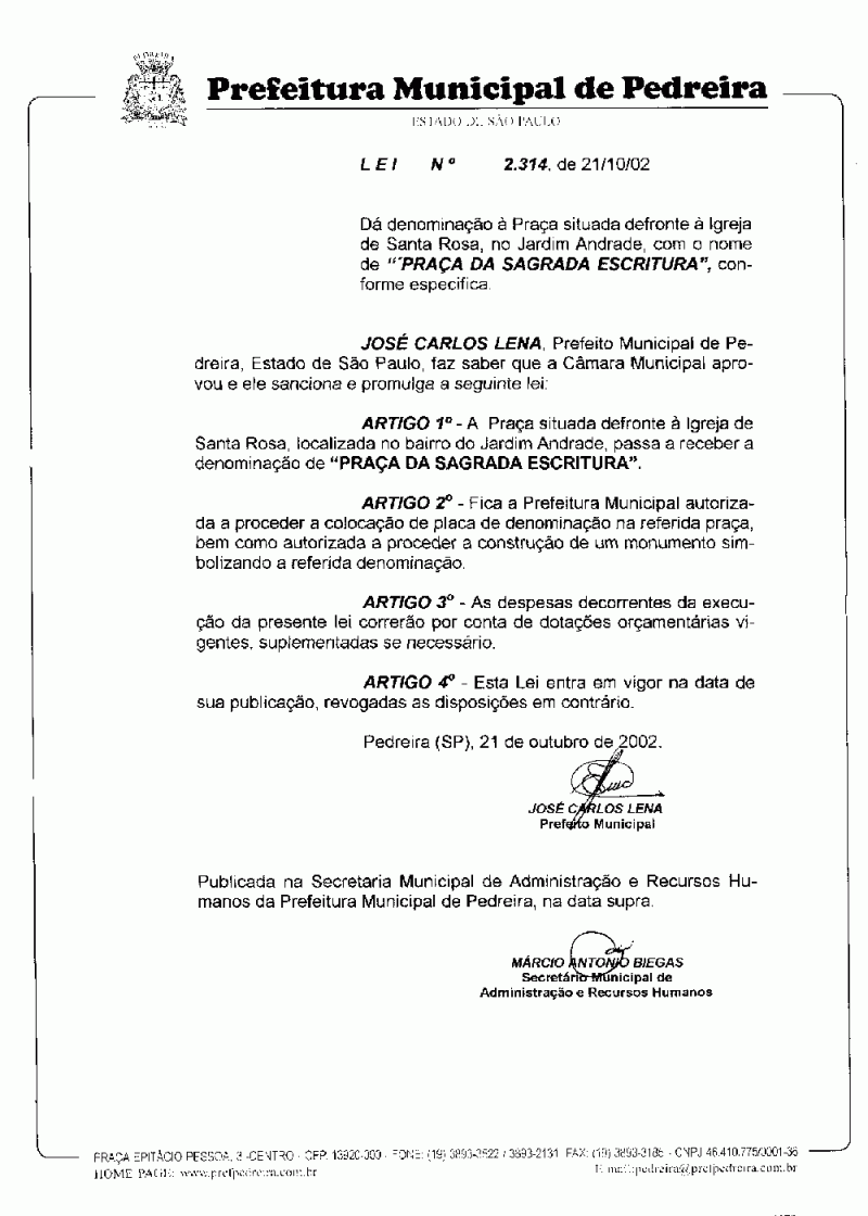 Lei Municipal - N° 2314 de 21/10/2002