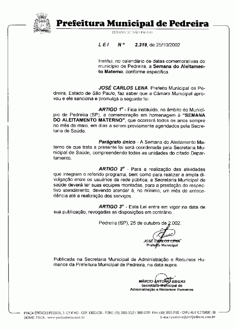 Lei Municipal - N° 2319 de 25/10/2002
