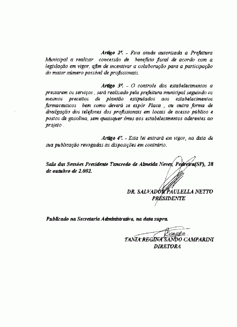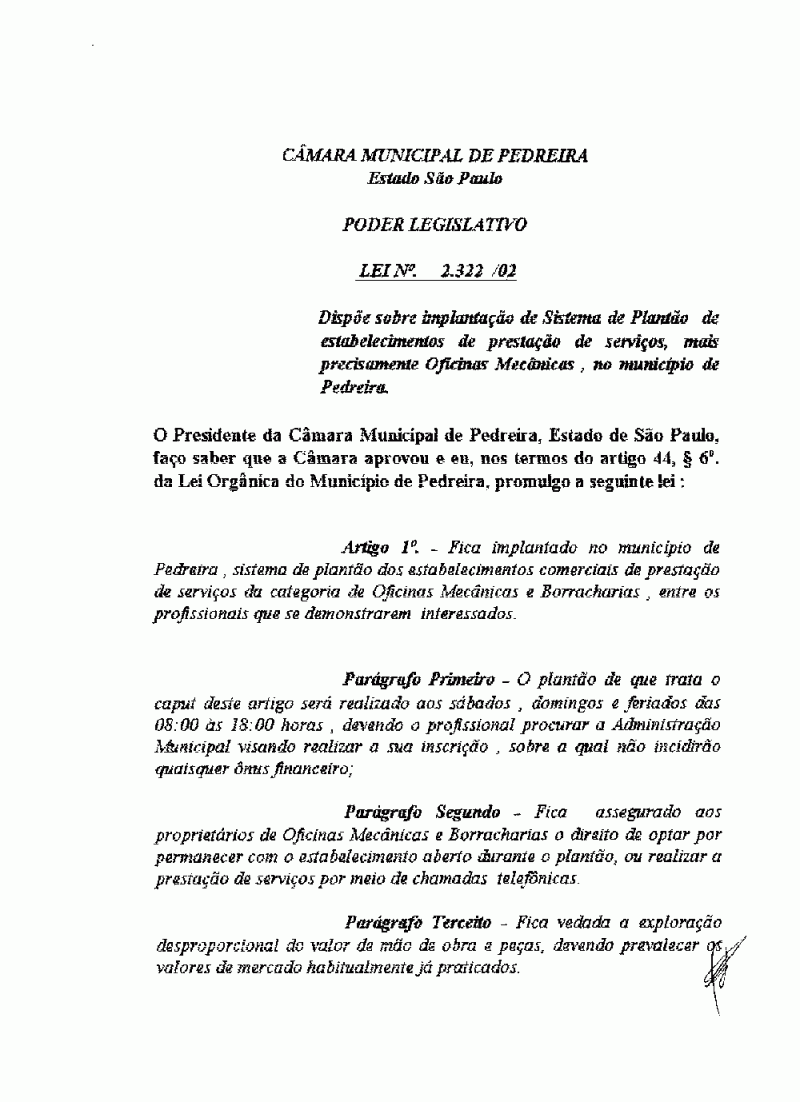 Ementa: Dispõe sobre implantação de Sistemas de Plantão de estabelecimentos de prestação de serviços, mais precisamente Oficinas Mecânicas, no município de Pedreira.