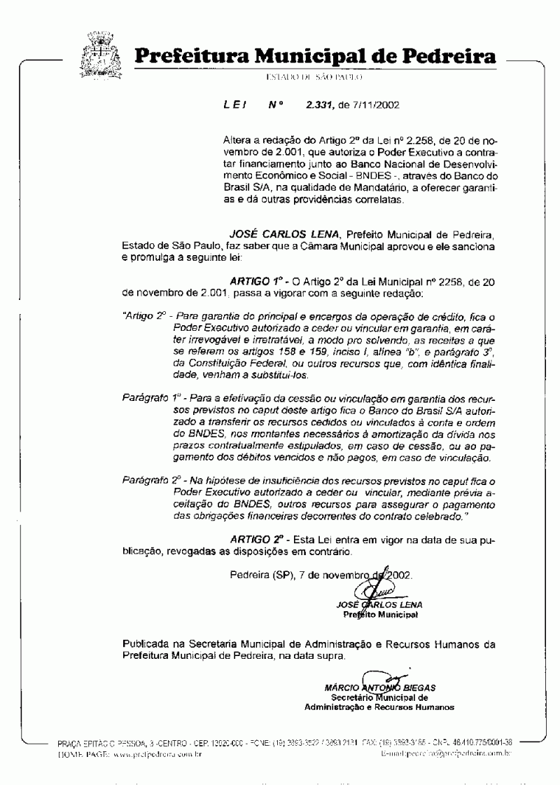 Ementa: Altera a redação do Artigo 2° da Lei n° 2.258, de 20 de novembro de 2.001, que autoriza o Poder Executivo a contratar financiamento junto ao Banco Nacional de Desenvolvimento Econômico e Social - BNDES -, através do Banco do Brasil S/A, na qualidade de Mandatário, a oferecer garantias e dá outras providências correlatas.
