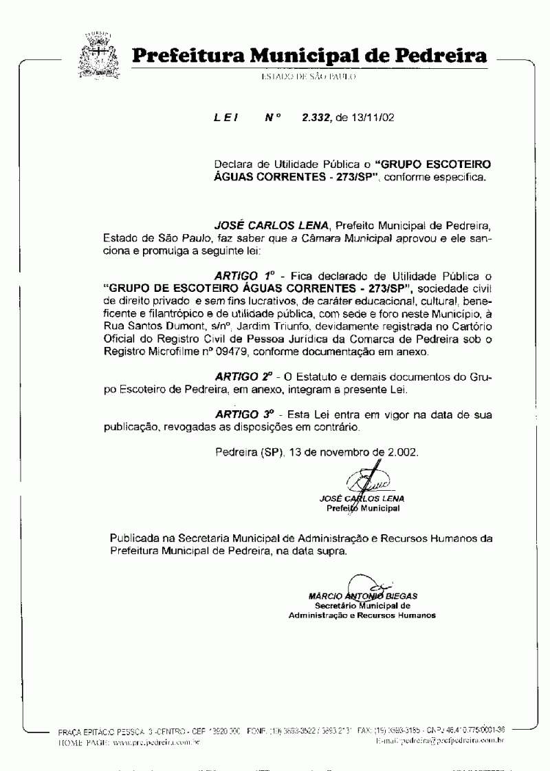 Ementa: Declara de Utilidade Pública o "Grupo Escoteiro Águas Correntes - 273/SP", conforme especifica.
