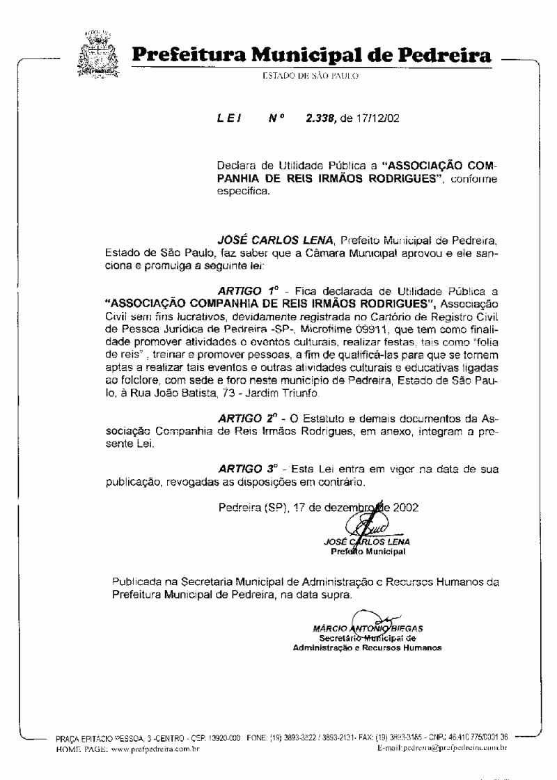 Ementa: Declara de Utilidade Pública a "Associação Companhia de Reis Irmãos Rodrigues", conforme especifica.