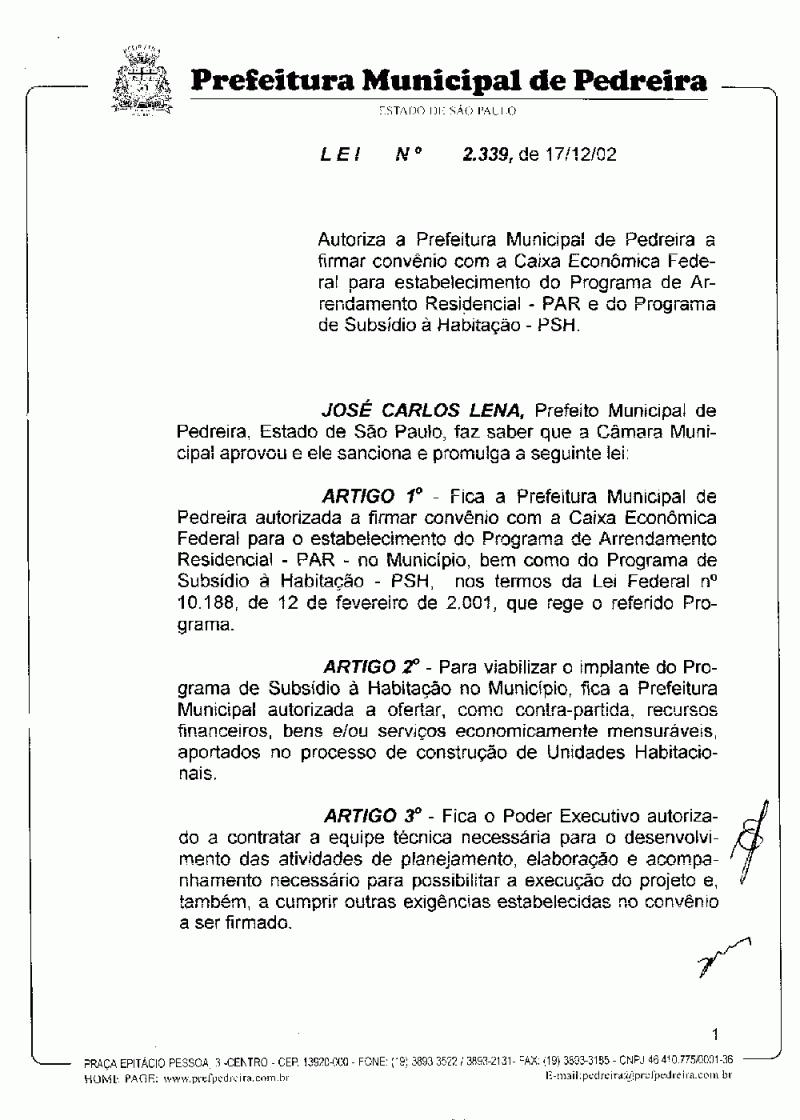 Ementa: Autoriza a Prefeitura Municipal de Pedreira a firmar convênio com a Caixa Econômica Federal para estabelecimento do Programa de Arrendamento Residencial - PAR e do Programa de Subsídio à Habitação - PSH.