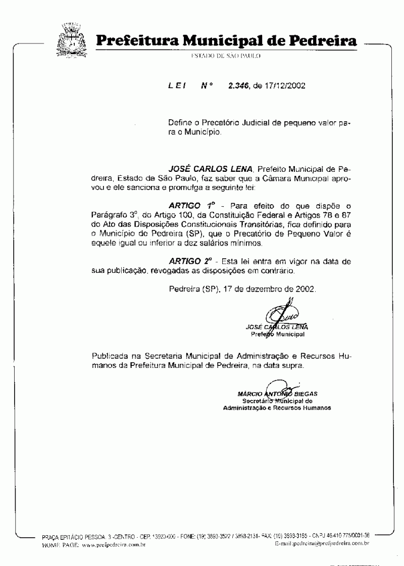 Lei Municipal - N° 2346 de 17/12/2002