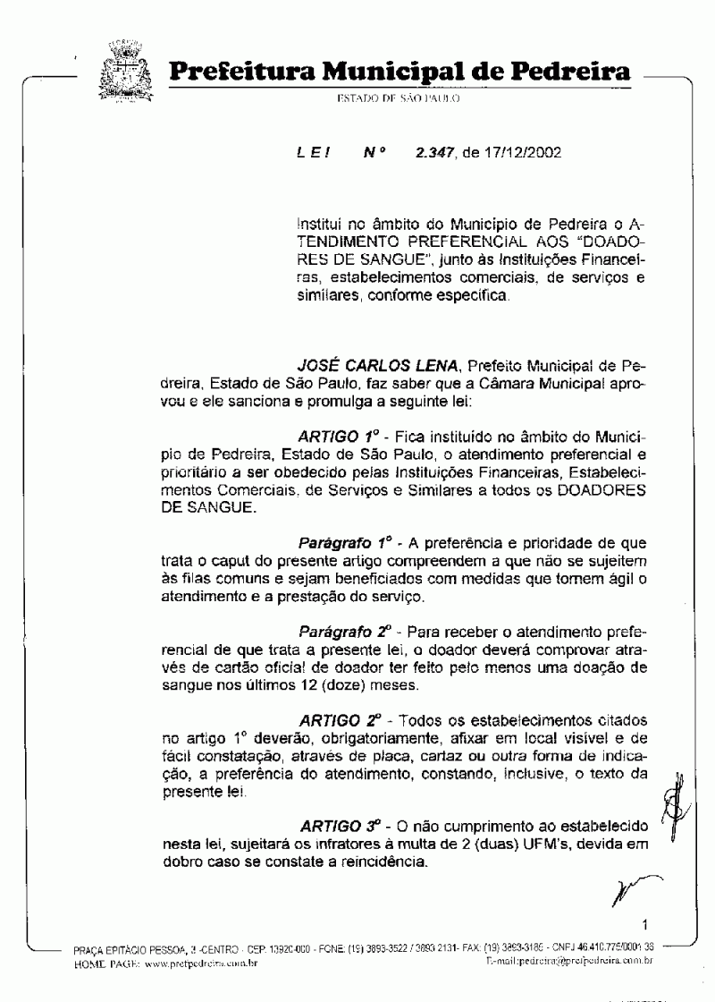Ementa: Institui no âmbito do Município de Pedreira o Atendimento Preferencial aos "Doadores de Sangue", junto às Instituições Financeiras, estabelecimentos comerciais, de serviços e similares, conforme especifica.