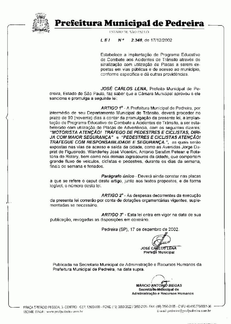 Ementa: Estabelece a implantação de Programa Educativo de Combate aos Acidentes de Trânsito através de sinalização com utilização de Placas a serem expostas em vias públicas e de acesso ao município, conforme especifica e dá outras providências.