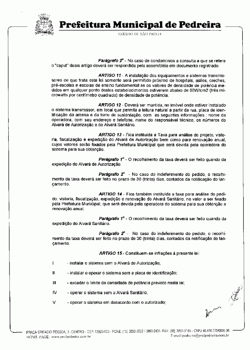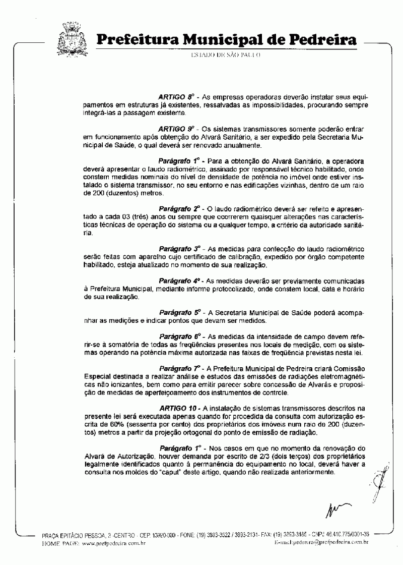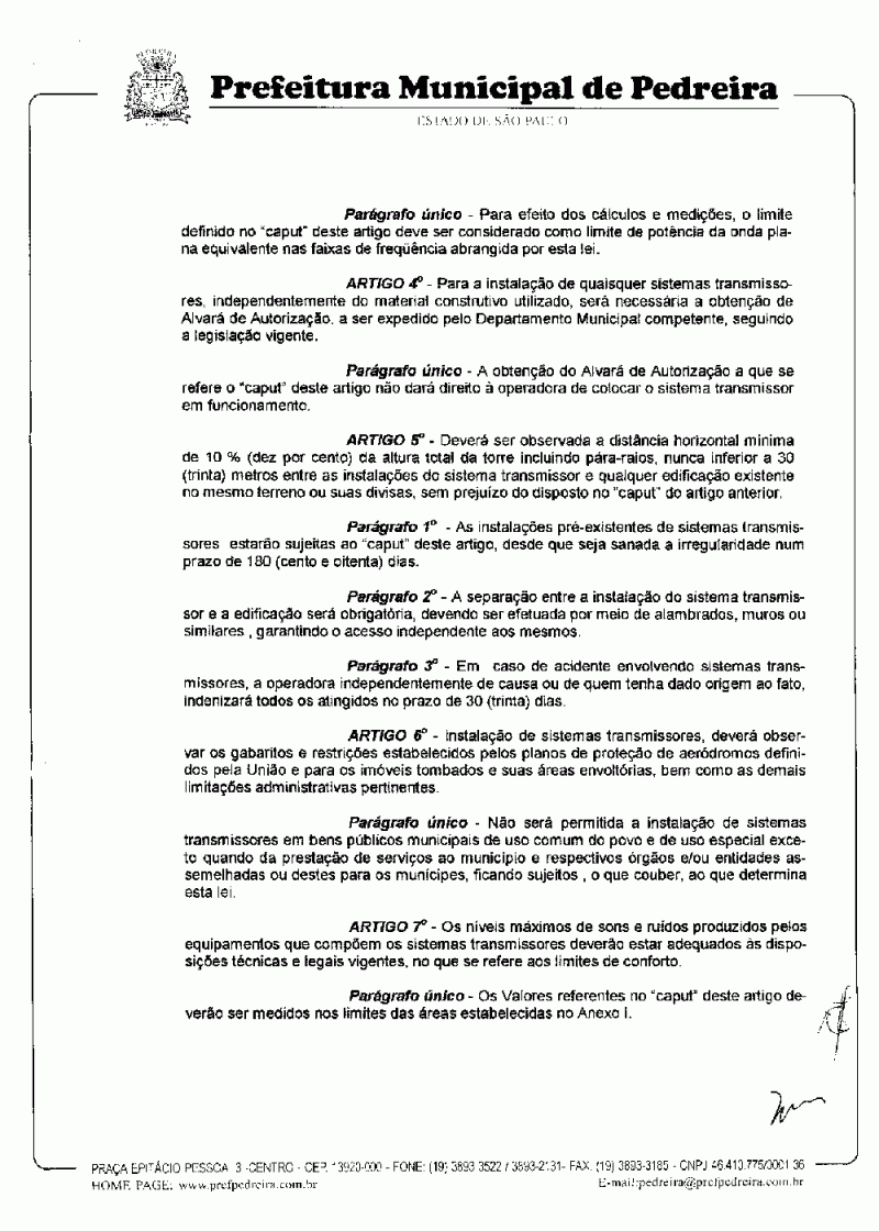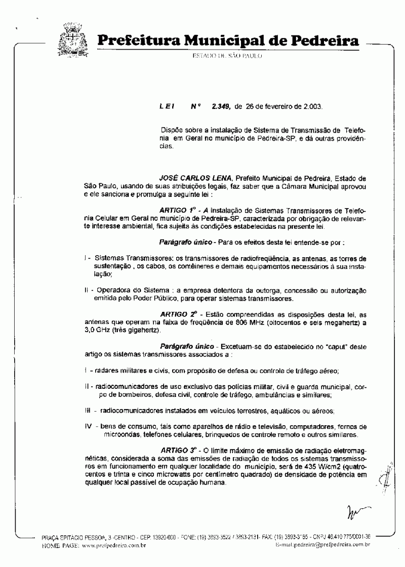 Ementa: Dispõe sobre a instalação de Sistemas de Transmissão de Telefonia em Geral no Município de Pedreira-SP, e dá outras providências.
