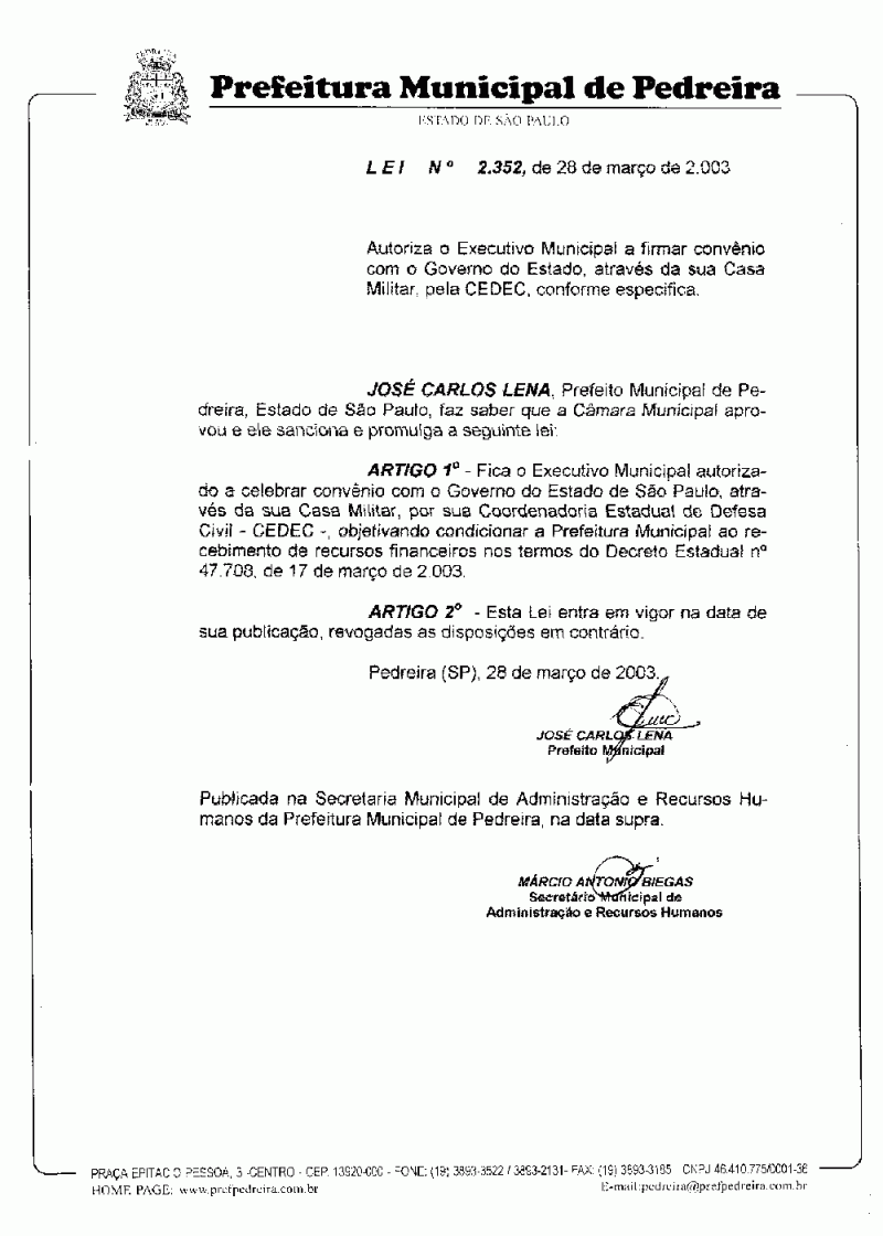 Ementa: Autoriza o Executivo Municipal a firmar convênio com o Governo do Estado, através da sua Casa Militar, pela CEDEC, conforme especifica.