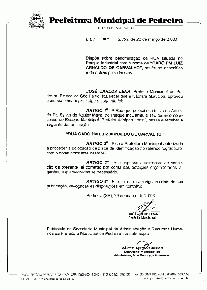 Ementa: Dispõe sobre denominação de Rua situada no Parque Industrial com o nome de "Cabo PM Luiz Arnaldo de Carvalho", conforme especifica e dá outras providências.