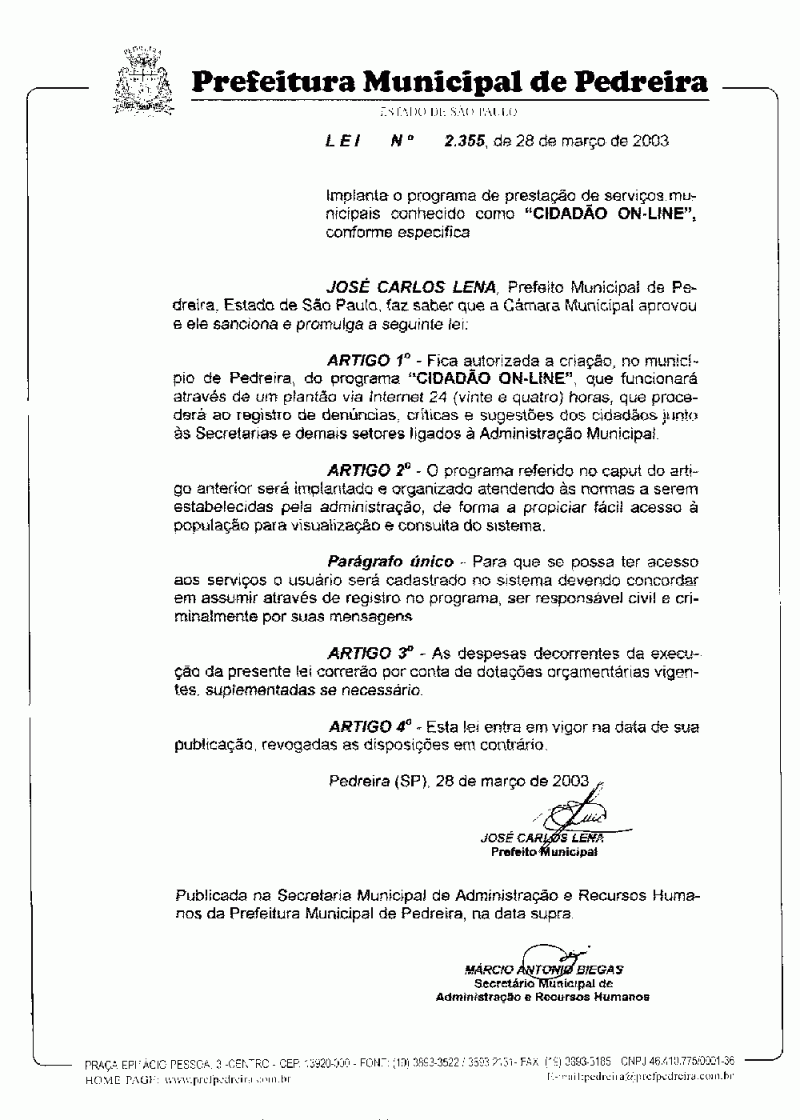 Ementa: Implanta o programa de prestação de serviços municipais conhecido como "Cidadão On-Line", conforme especifica.