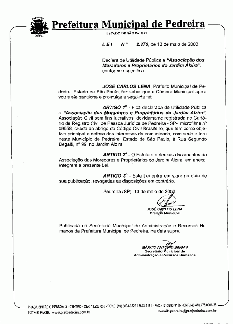 Ementa: Declara de Utilidade Pública a "Associação dos Moradores e Proprietários do Jardim Alzira", conforme especifica.