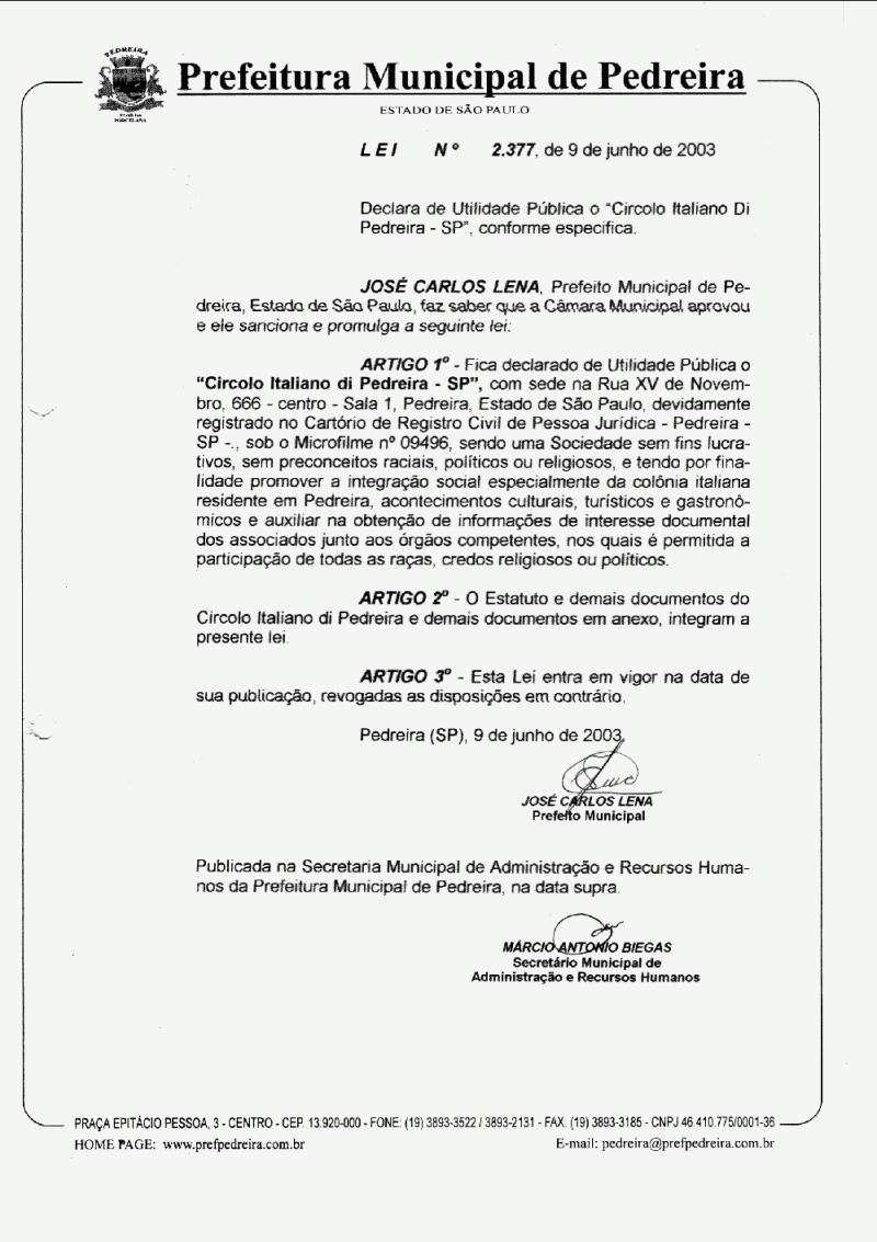 Ementa: Declara de Utilidade Publica o "Circulo Italiano Di Pedreira - SP", conforme especifica.