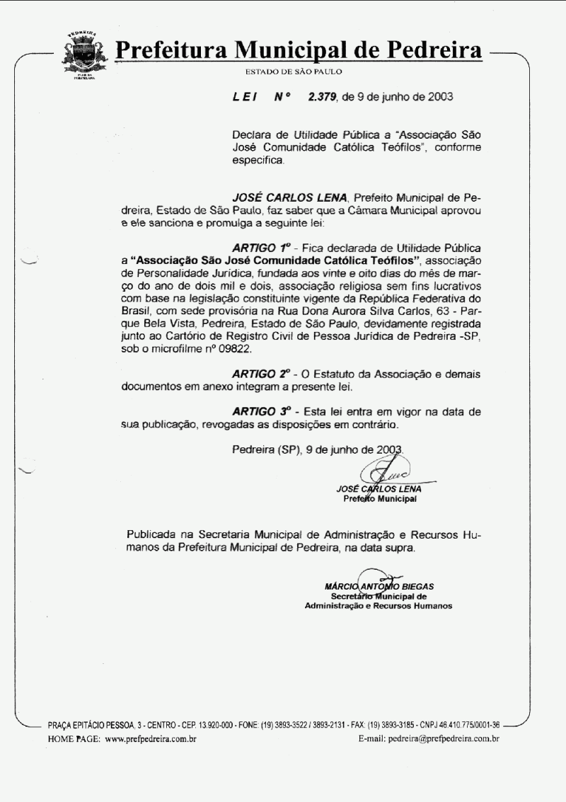 Ementa: Declara da Utilidade Pública a "Associação São José Comunidade Católica Teófilos", conforme especifica.