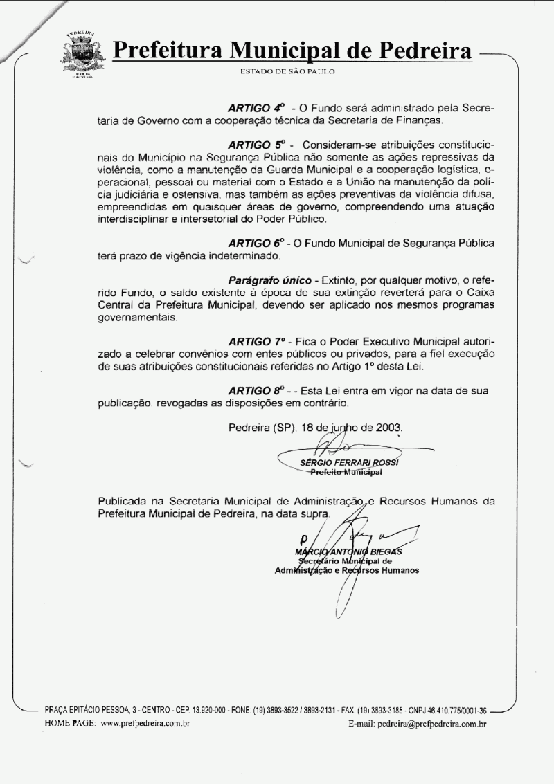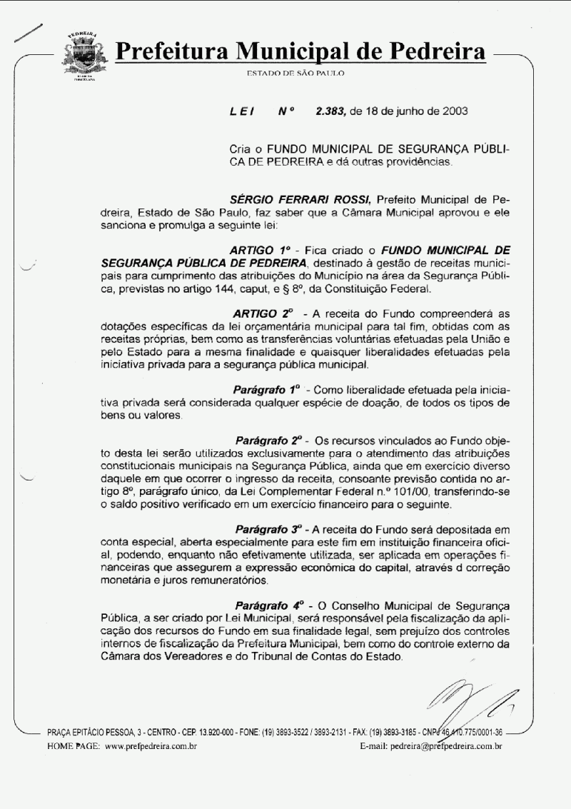Ementa: Cria o Fundo Municipal de Segurança Pública de Pedreira e dá outras providências.