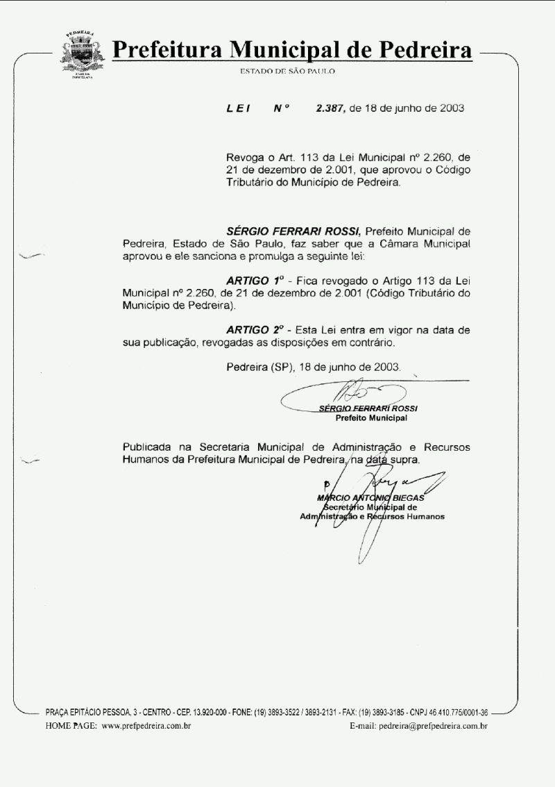 Ementa: Revoga o Art. 113 da Lei Municipal n° 2.260, de 21 de dezembro de 2.001, que aprovou o Código Tributário do Município de Pedreira.