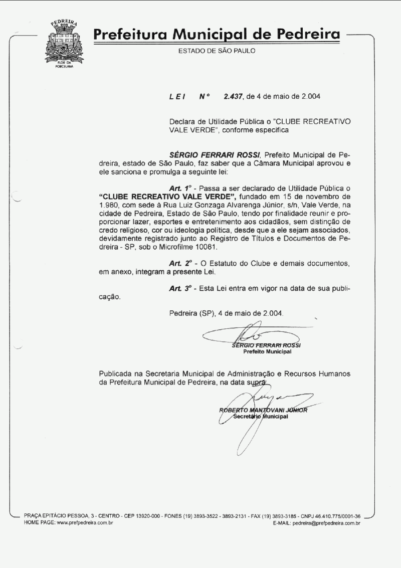 Ementa: Declara de utilidade pública o "Clube Recreativo Vale Verde", conforme especifica.
