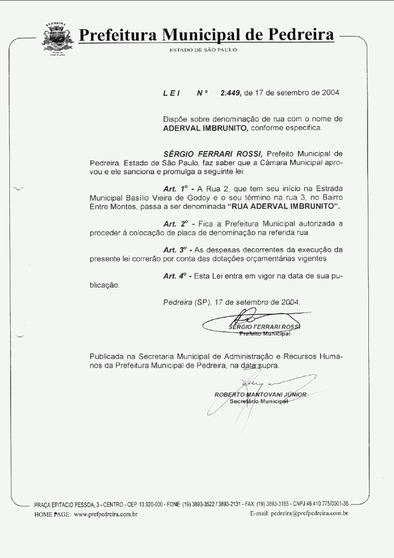 Ementa: Dispõe sobre denominação de rua com o nome de Aderval Imbrunito, conforme especifica.