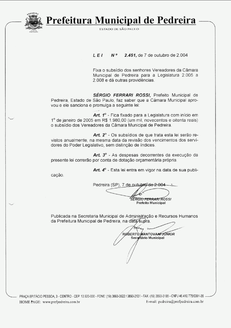 Ementa: Fixa o subsídio dos senhores vereadores da Câmara Municipal de Pedreira para a legislatura 2005 a 2008 e dá outras providências.