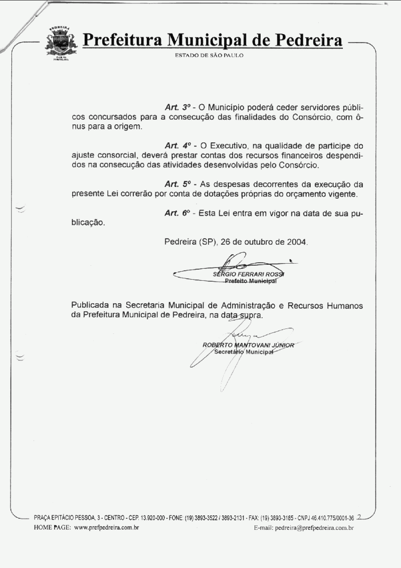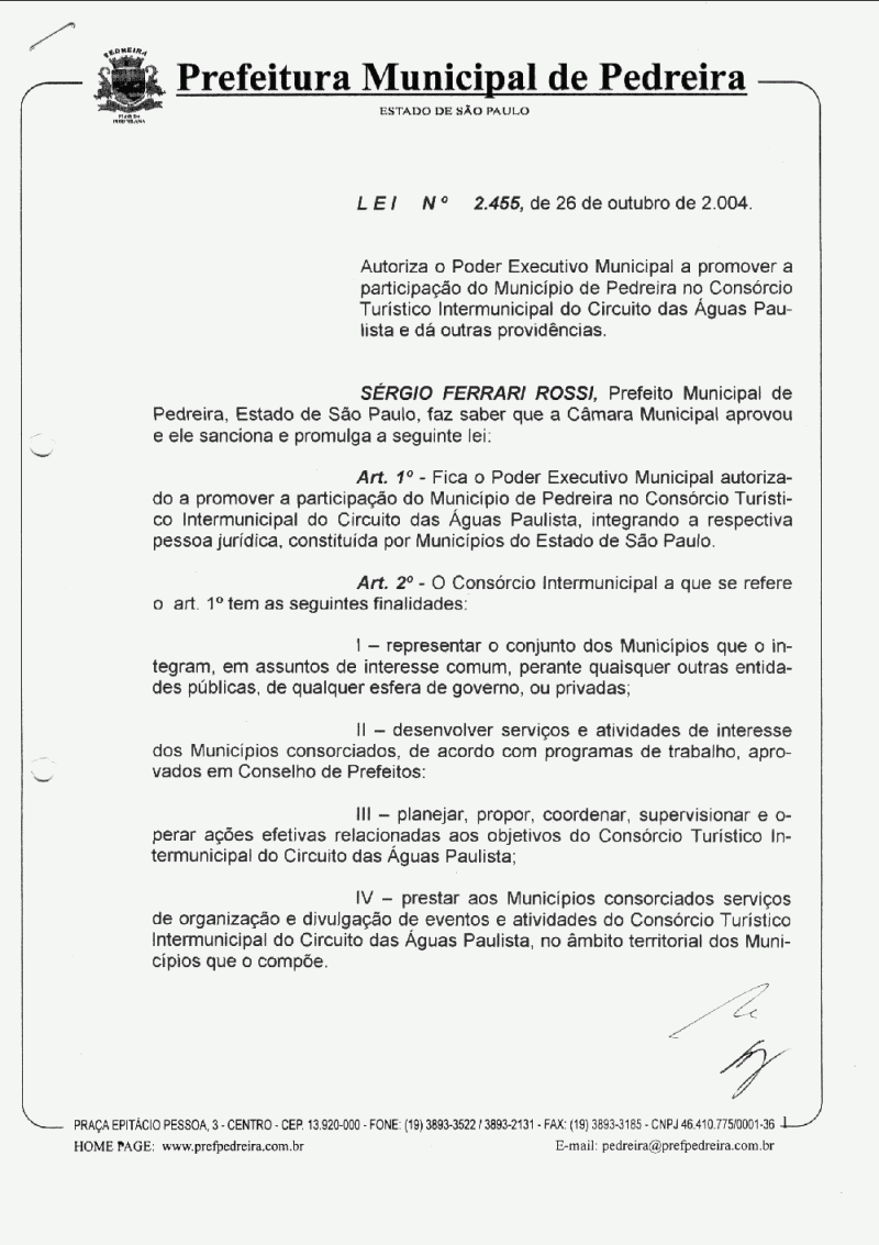Ementa: Autoriza o Poder Executivo Municipal a promover a participação do Município de Pedreira no Consórcio Turístico Intermunicipal do Circuito das Águas Paulista e dá outras providências.