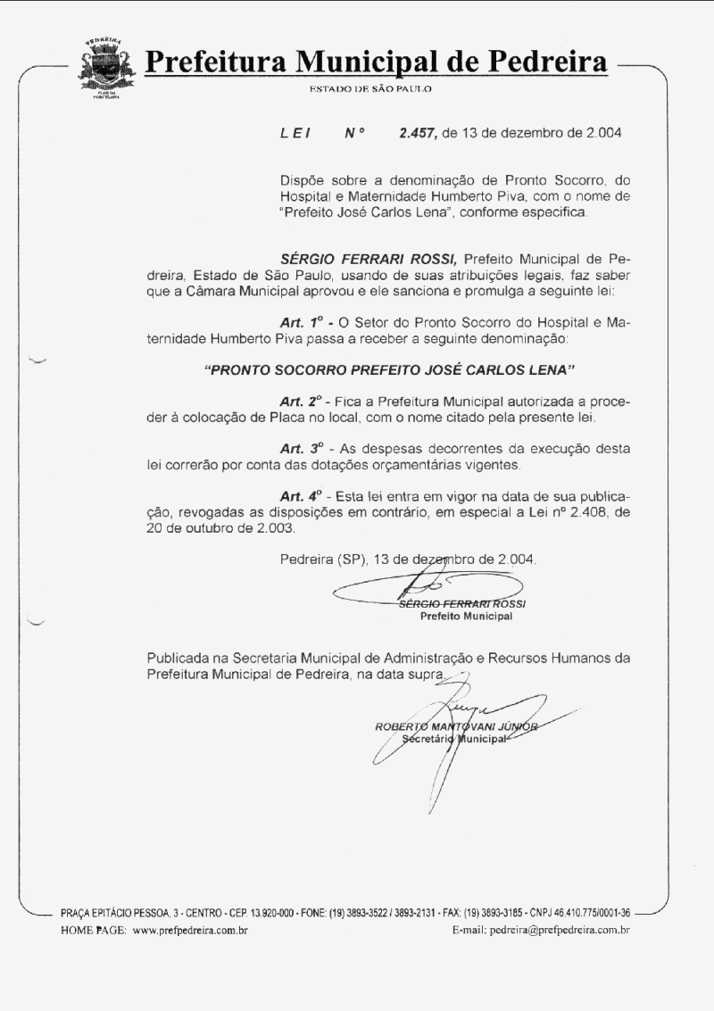 Ementa: Dispõe sobre a denominação de Pronto Socorro, do Hospital e Maternidade Humberto Piva, com o nome de "Prefeito José Carlos Lena", conforme especifica.