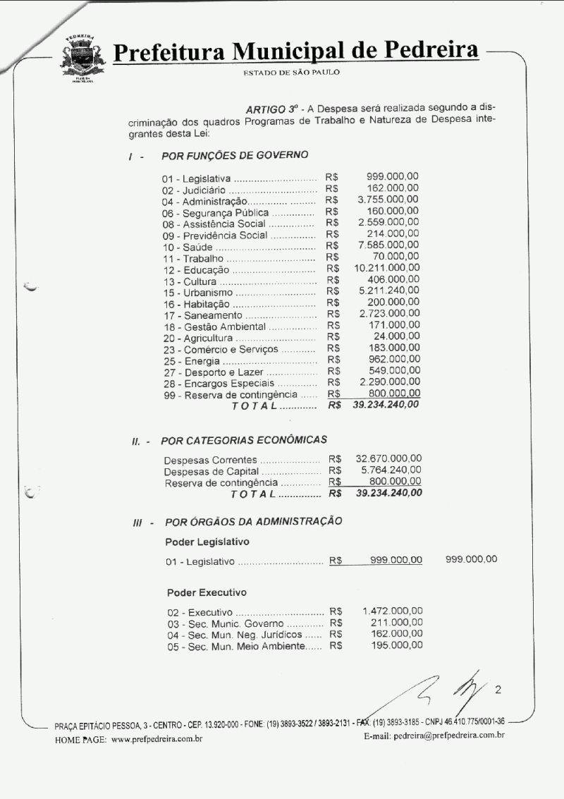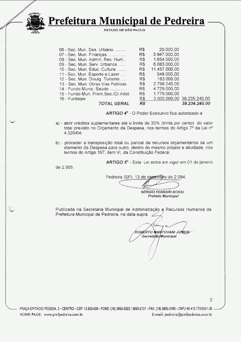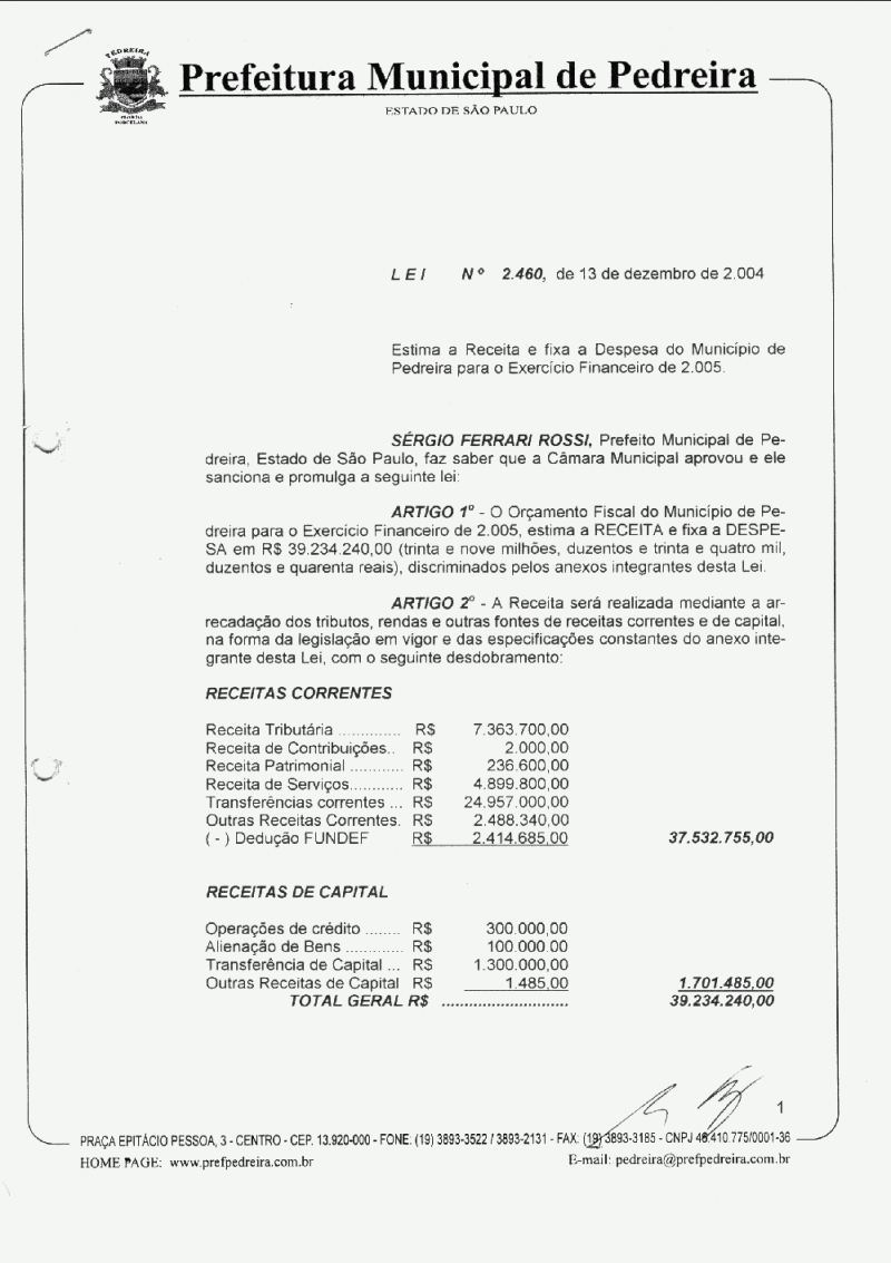 Ementa: Estima a Receita e fixa a Despesa do Município de Pedreira para o exercício financeiro de 2005.