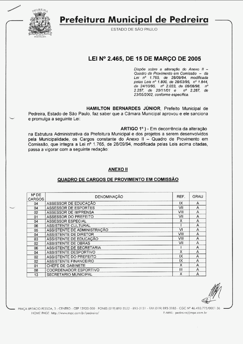 Ementa: Dispõe sobre a alteração do Anexo II - Quadro de Provimento em Comissão - da Lei nº 1765, de 28/09/94, modificada pelas Leis nº 1800, de 28/03/95, nº 1844, de 24/10/95, nº 2033, de 06/08/98, nº 2257, de 20/11/01 e nº 2287, de 23/05/2002, conforme especifica.
