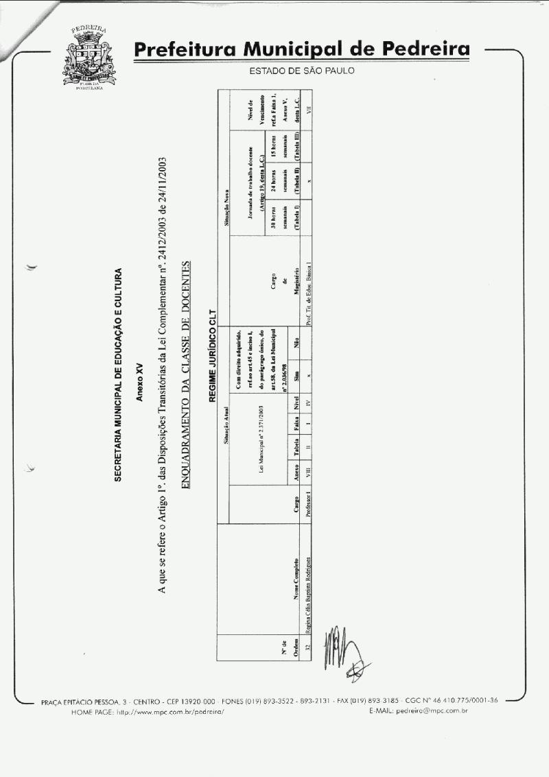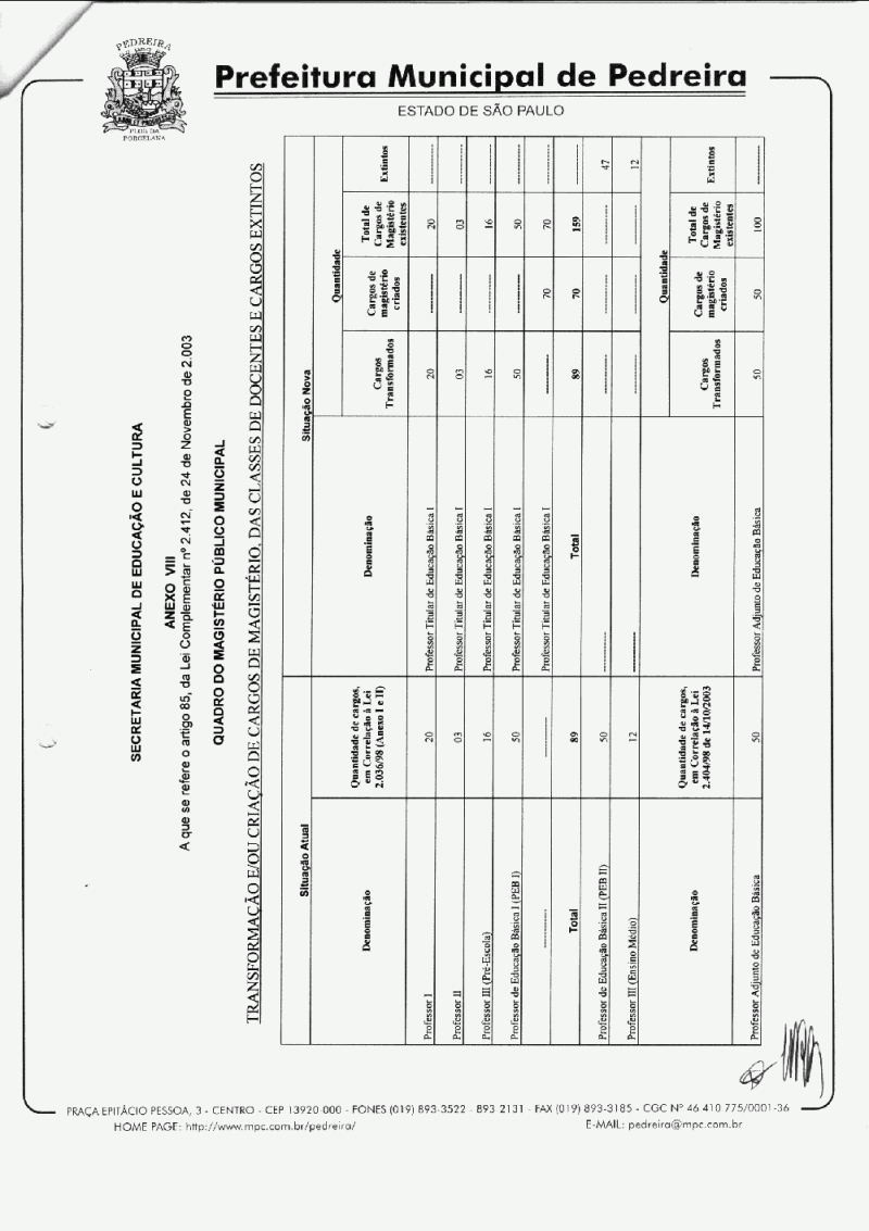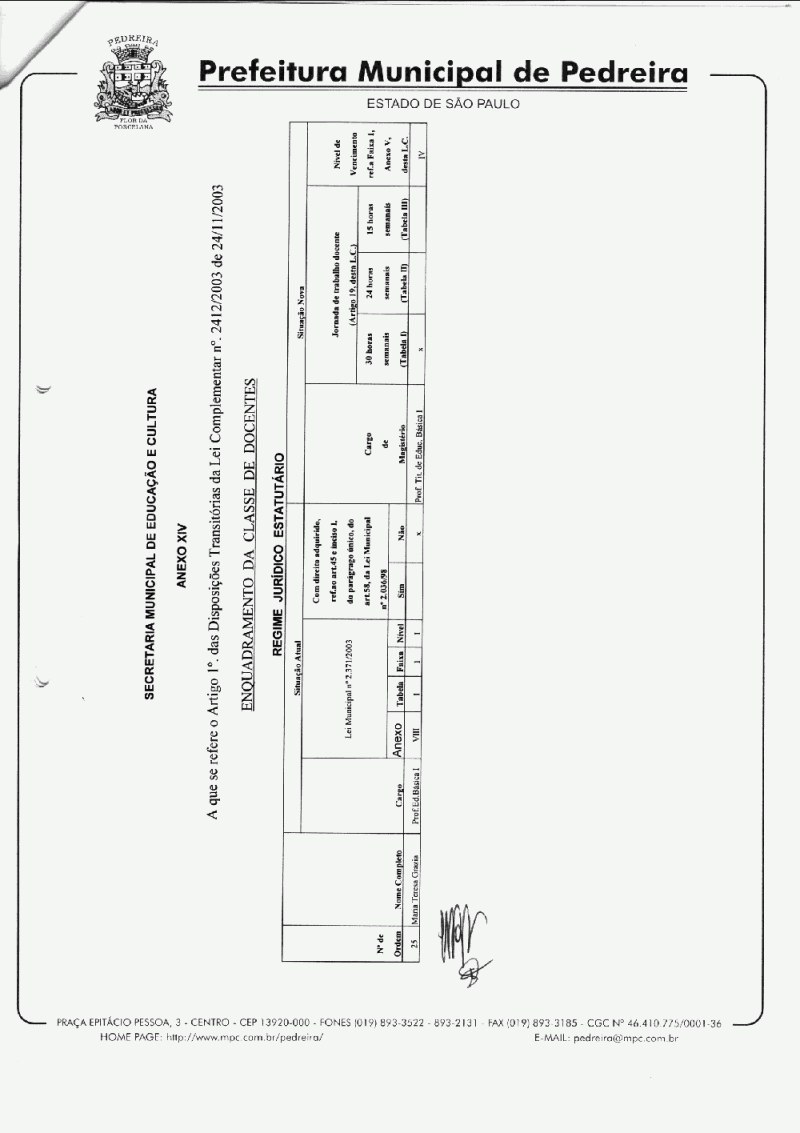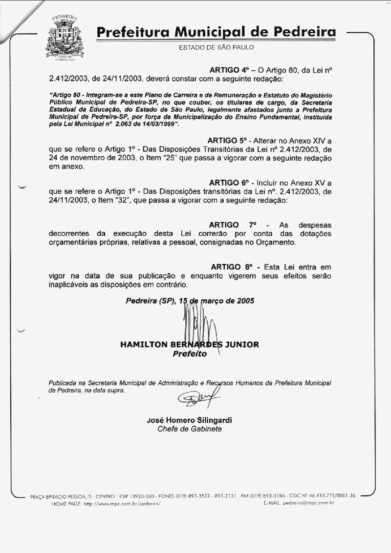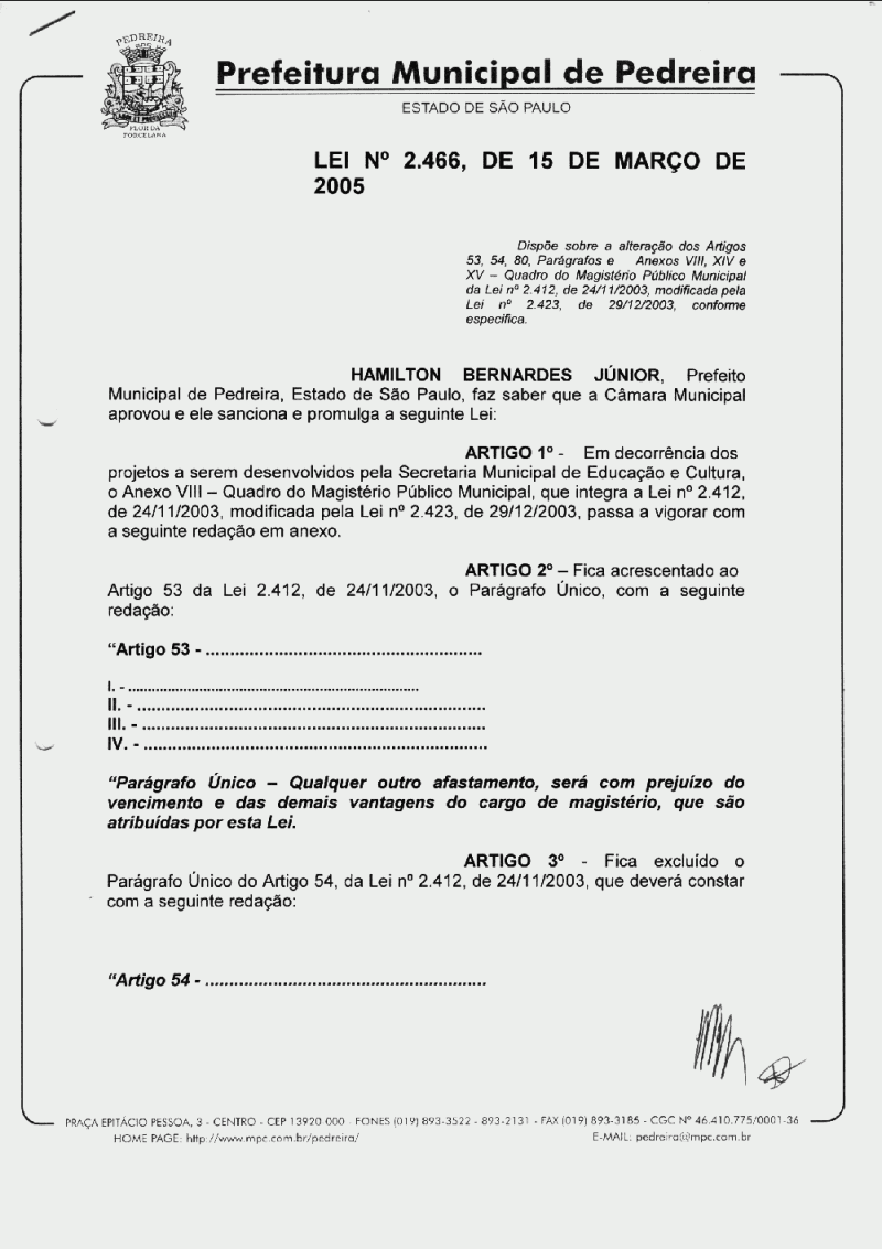 Ementa: Dispõe sobre a alteração dos Artigos 53, 54, 80, Parágrafos e Anexos VIII, XIV e XV - Quadro do Magistério Público Municipal da Lei nº 2412, de 24/11/2003, modificada pela Lei nº 2423, de 29/12/2003, conforme especifica.