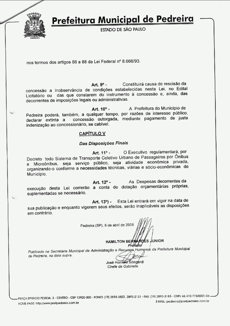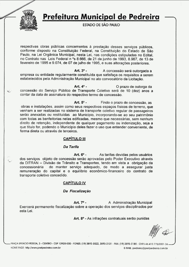 Ementa: Autoriza a concessão do Serviço Público de Transporte Coletivo Urbano de Passageiro por Ônibus e Microônibus no Município de Pedreira, fixa seus termos e dá outras providências.