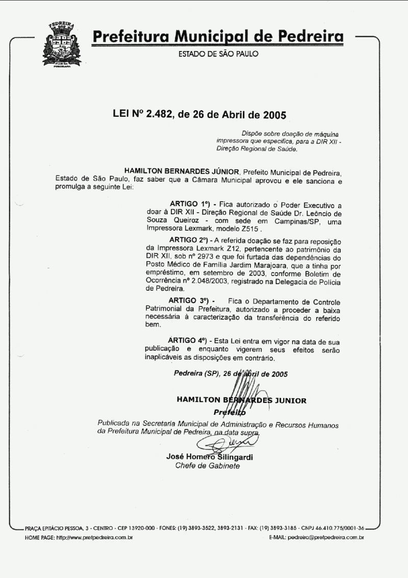 Ementa: Dispõe sobre doação de máquina impressora que especifica, para a DIR XII - Direção Regional de Saúde.