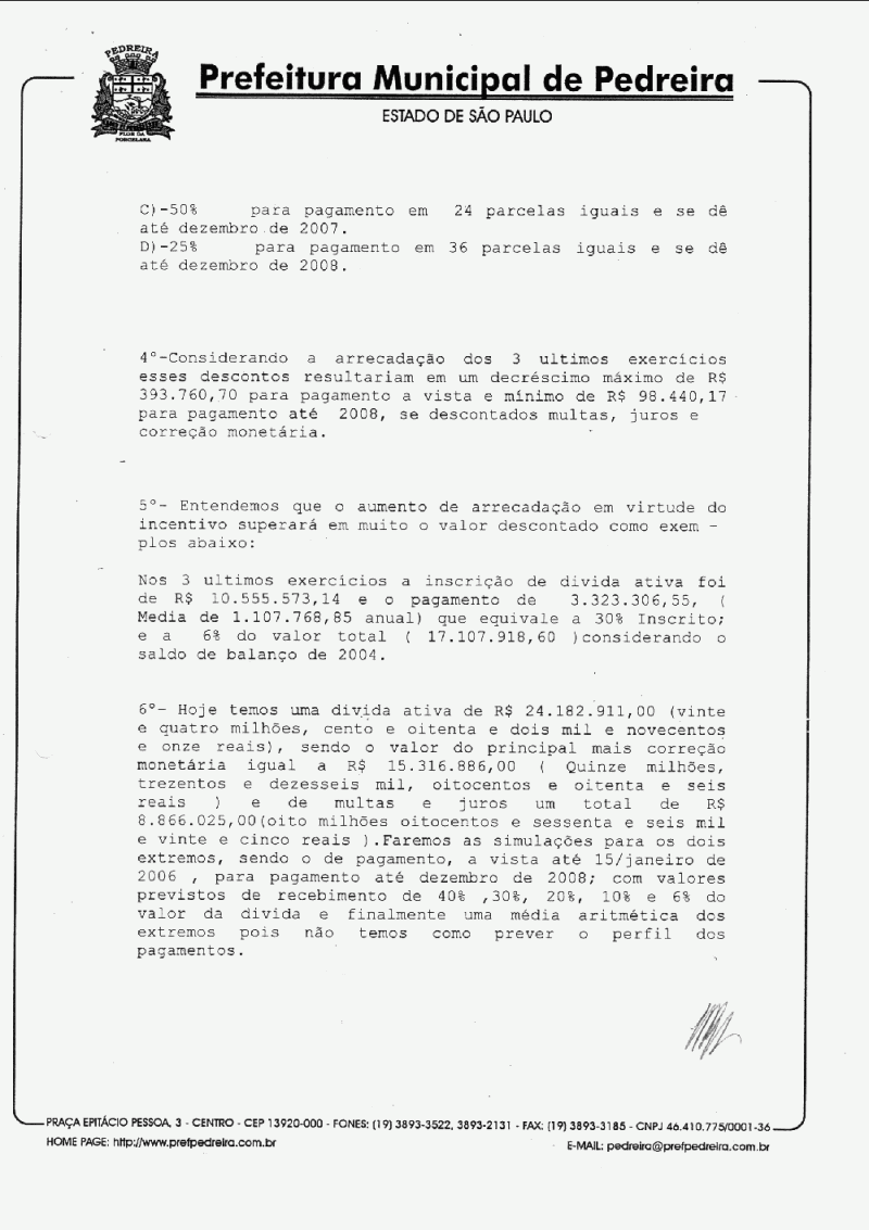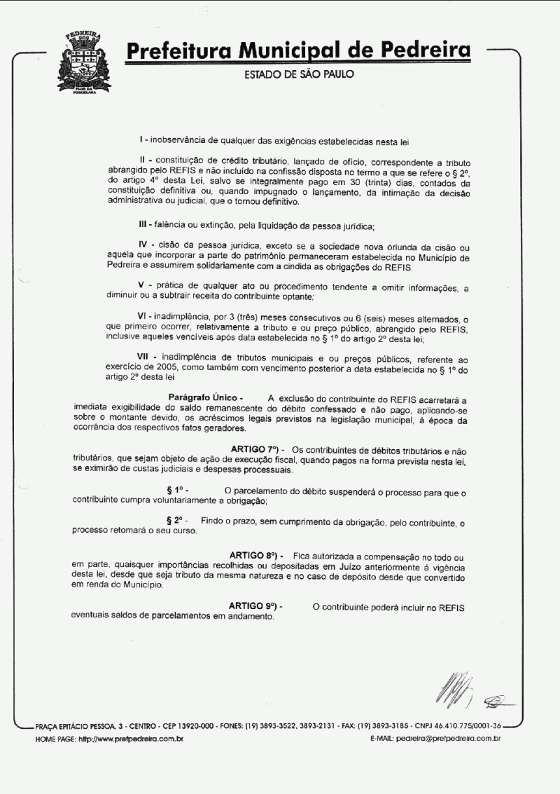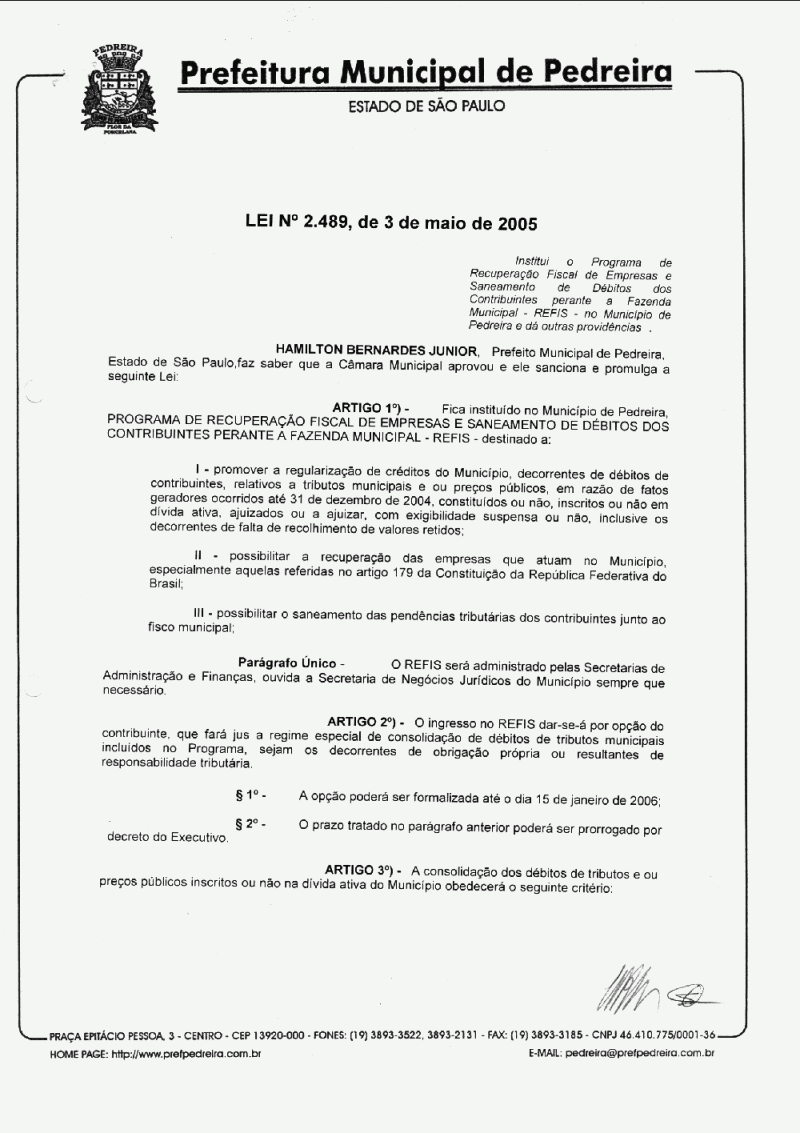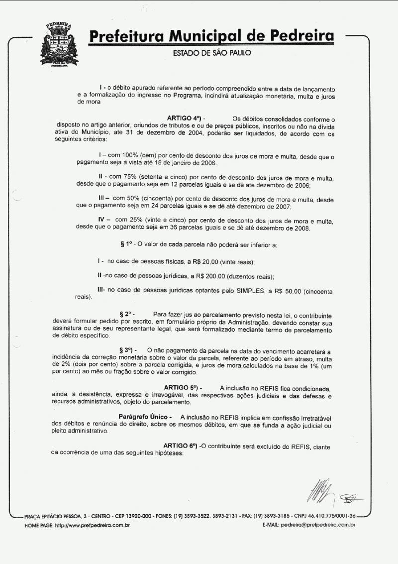 Ementa: Institui o Programa de Recuperação Fiscal de Empresas e Saneamento de Débitos dos Contribuintes perante a Fazenda Municipal - REFIS - no município de Pedreira e dá outras providências.