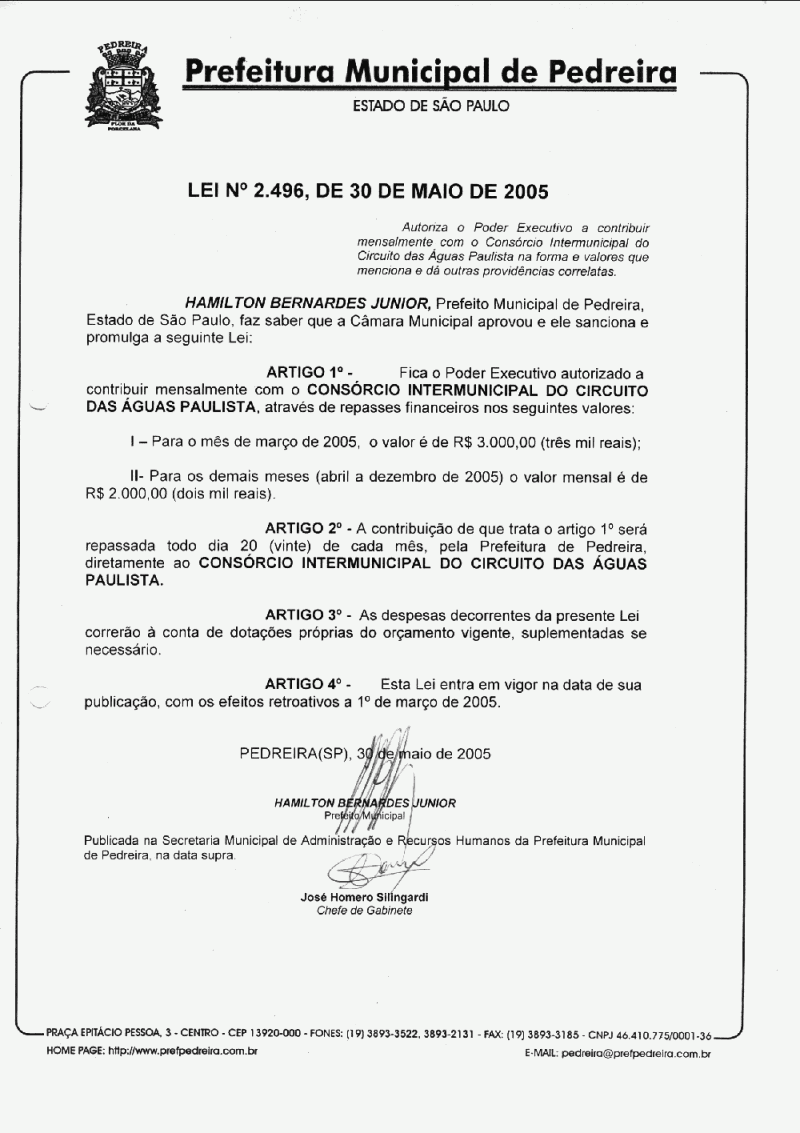 Ementa: Autoriza o Poder Executivo a contribuir mensalmente com o Consórcio Intermunicipal do Circuito das Águas Paulista na forma e valores que menciona e dá outras providências correlatas.