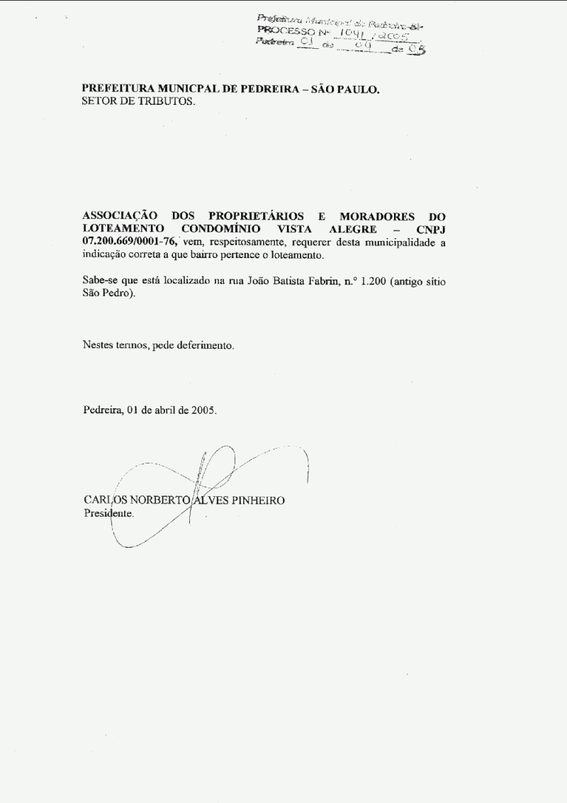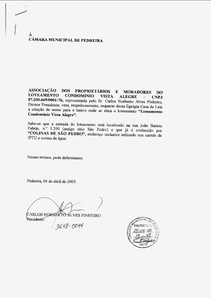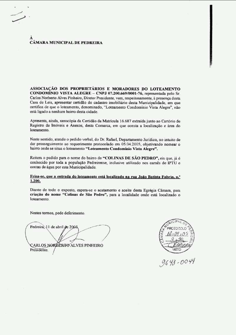 Ementa: Atribui denominação de área como Bairro "Colinas de São Pedro", conforme especifica.
