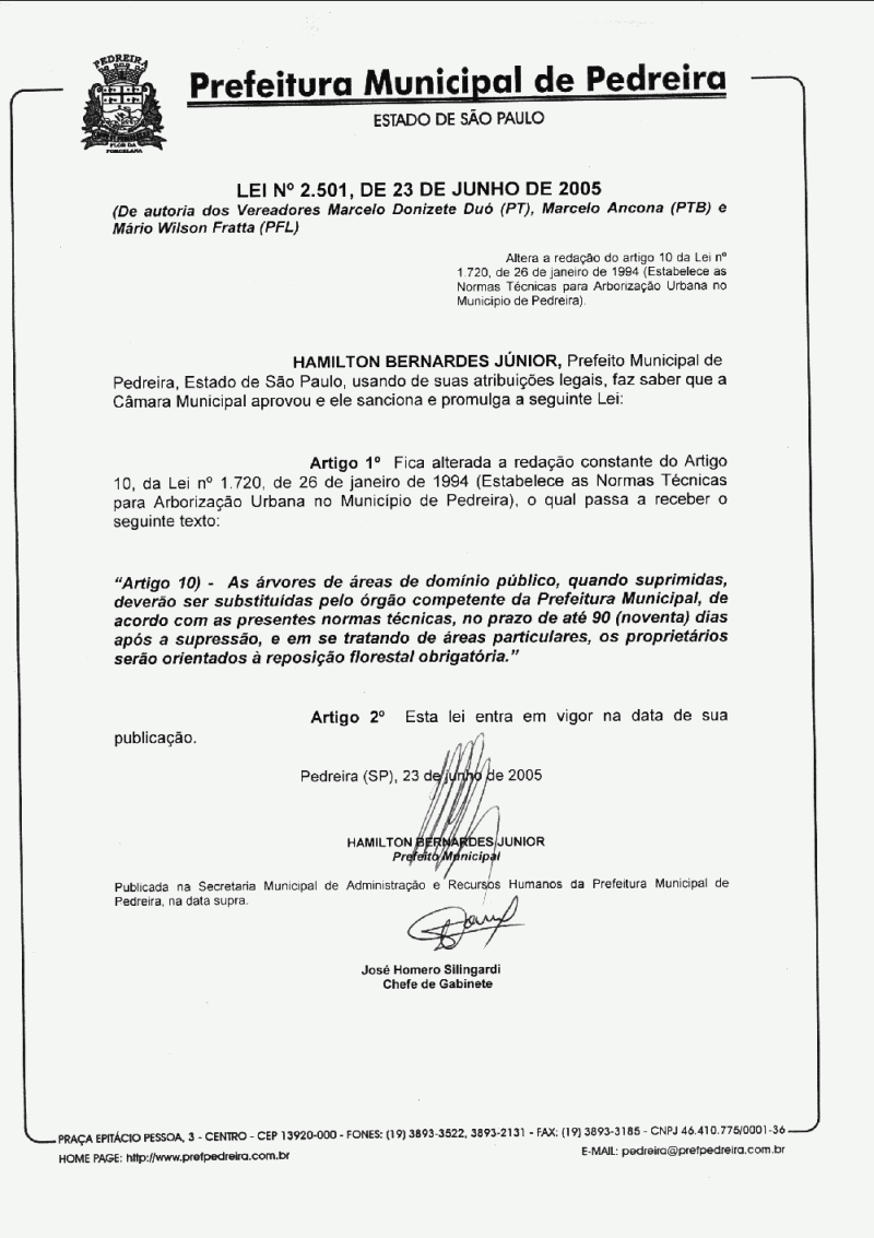 Ementa: Altera a redação do artigo 10 da Lei nº 1720, de 26 de janeiro de 1994 (Estabelece as Normas Técnicas para arborização urbana no Município de Pedreira).
