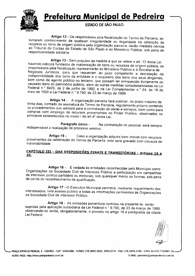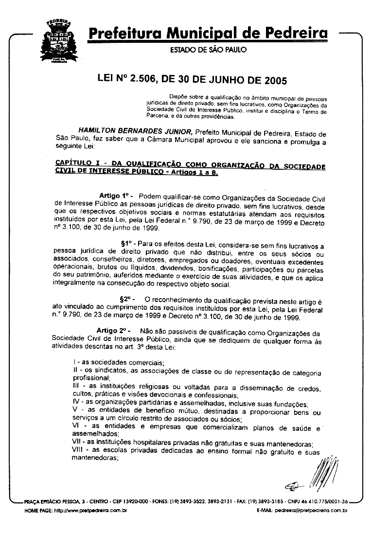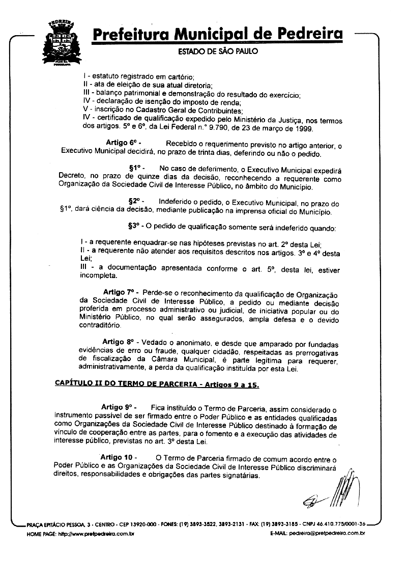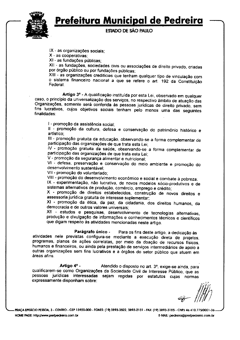 Ementa: Dispõe sobre a qualificação no âmbito municipal de pessoas jurídicas de direito privado, sem fins lucrativos, como Organizações da Sociedade Civil de Interesse Público, institui e disciplina o Termo de Parceria, e dá outras providências.