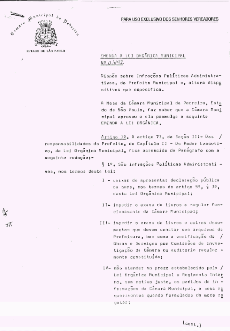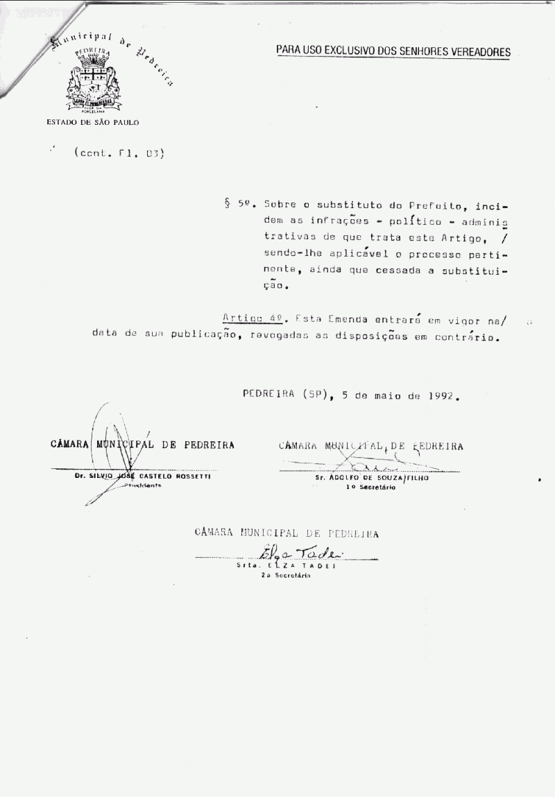 Emenda a Lei Organica do Municipio de Pedreira - N° 3 de 05/05/1992