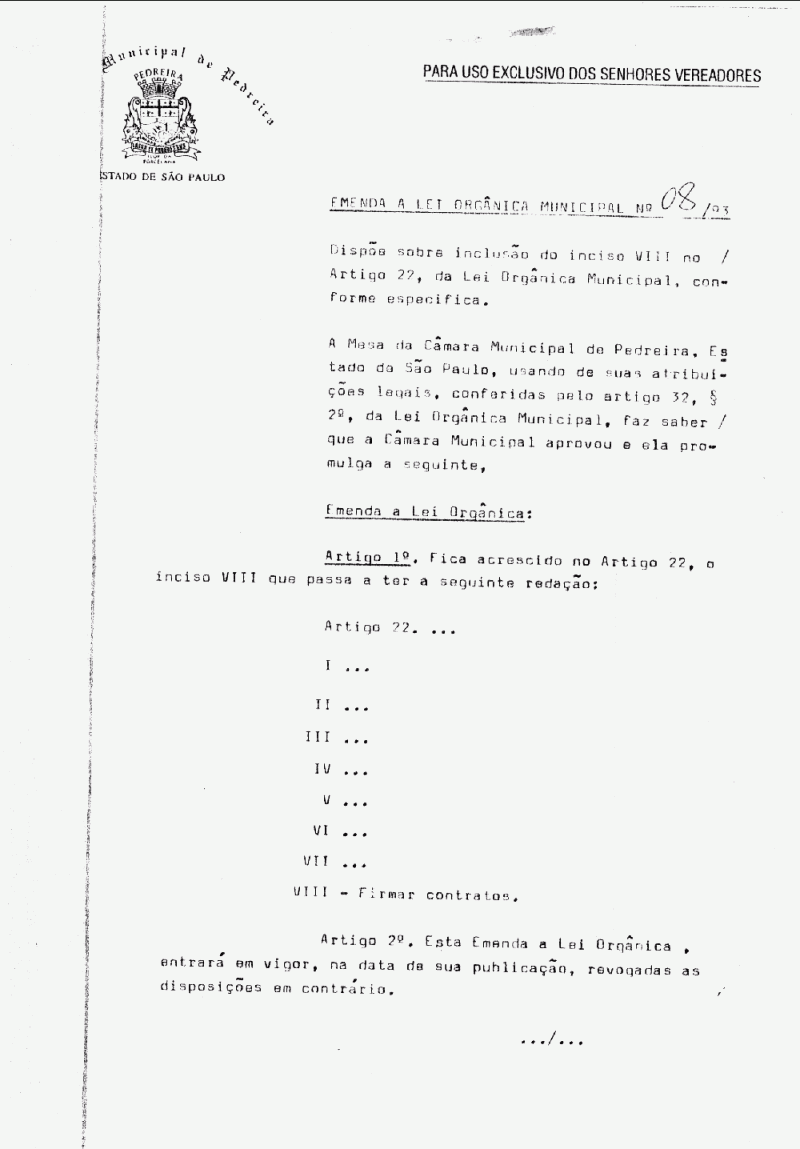 Emenda a Lei Organica do Municipio de Pedreira - N° 8 de 17/06/1993