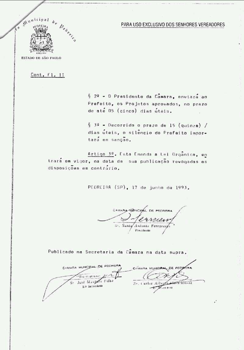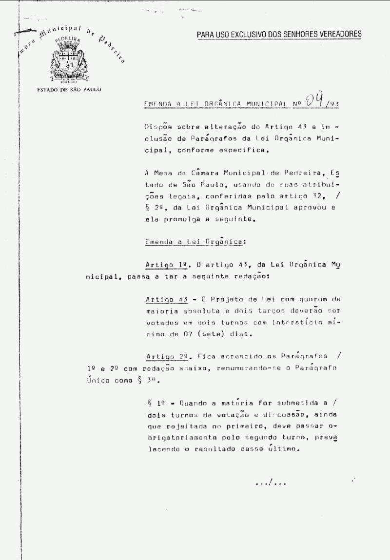 Emenda a Lei Organica do Municipio de Pedreira - N° 9 de 17/06/1993