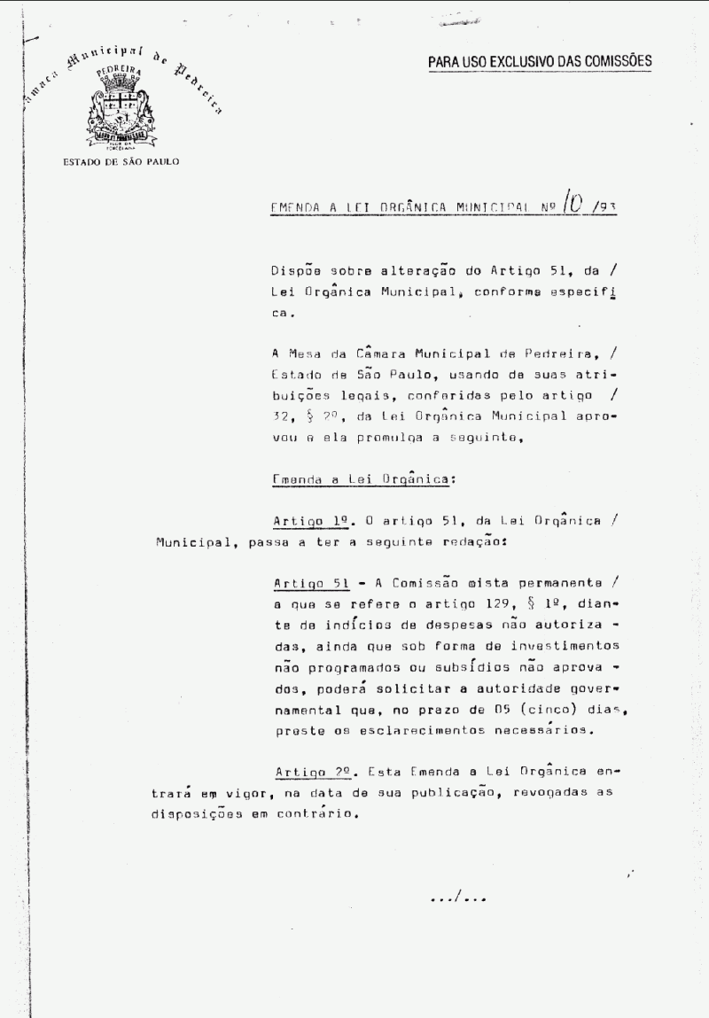 Emenda a Lei Organica do Municipio de Pedreira - N° 10 de 17/06/1993