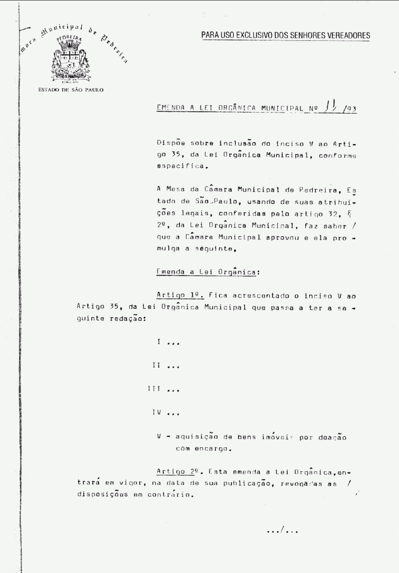 Emenda a Lei Organica do Municipio de Pedreira - N° 11 de 17/06/1993
