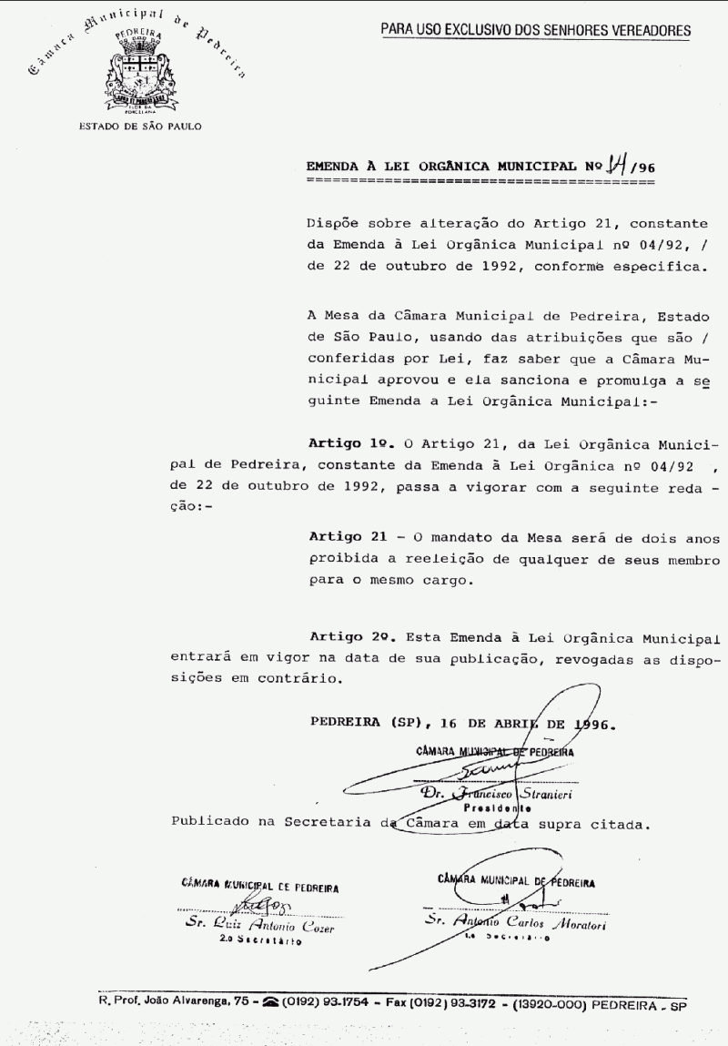 Emenda a Lei Organica do Municipio de Pedreira - N° 14 de 16/04/1996