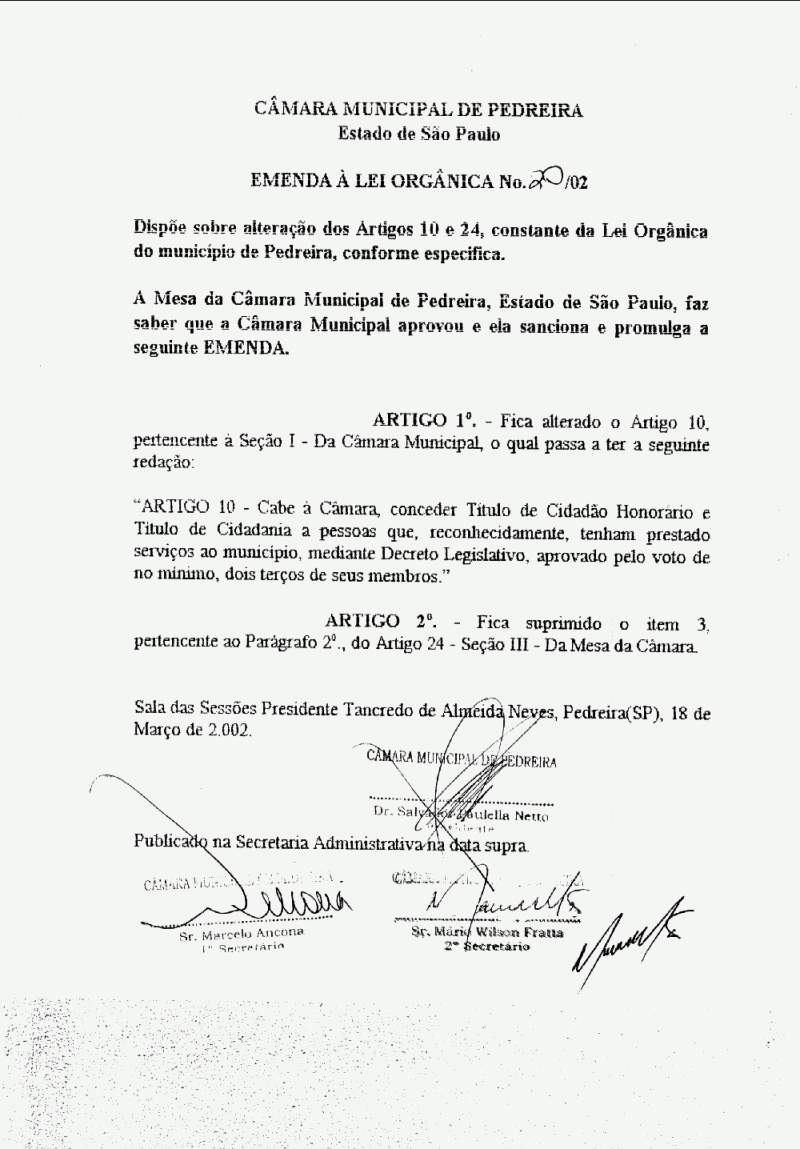 Emenda a Lei Organica do Municipio de Pedreira - N° 20 de 18/03/2002