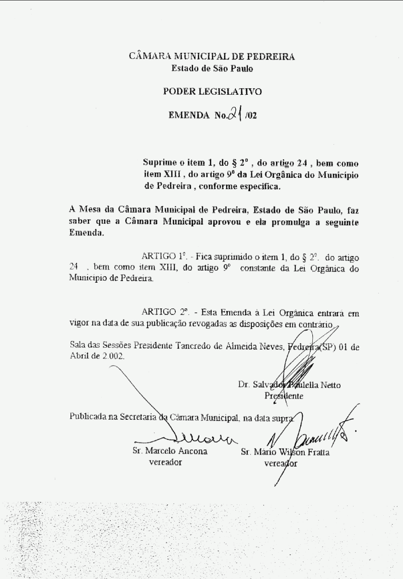 Emenda a Lei Organica do Municipio de Pedreira - N° 21 de 01/04/2002
