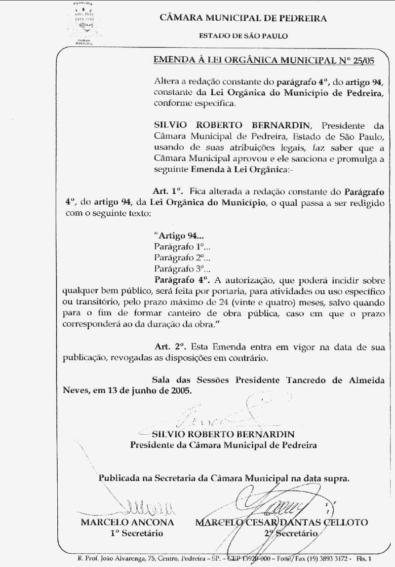 Emenda a Lei Organica do Municipio de Pedreira - N° 25 de 13/06/2005