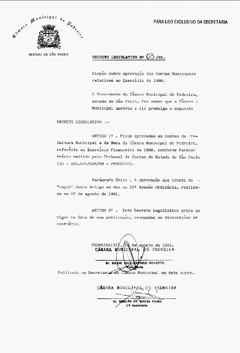 Ementa: Dispõe sobre aprovação das contas Municipais relativas ao Exercício de 1988