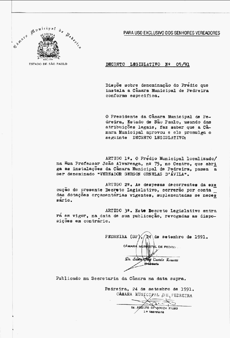 Ementa: Dispõe sobre denominação do Prédio que instala a Câmara Municipal de Pedreira conforme específica