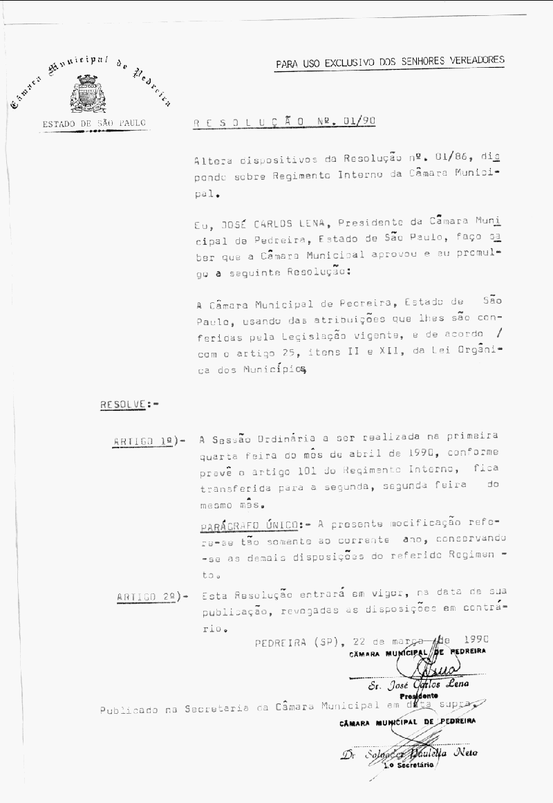 Ementa: Altera dispositivos da Resolução n] 01/86, dispondo sobre Regimento Interno da Câmara Municipal.